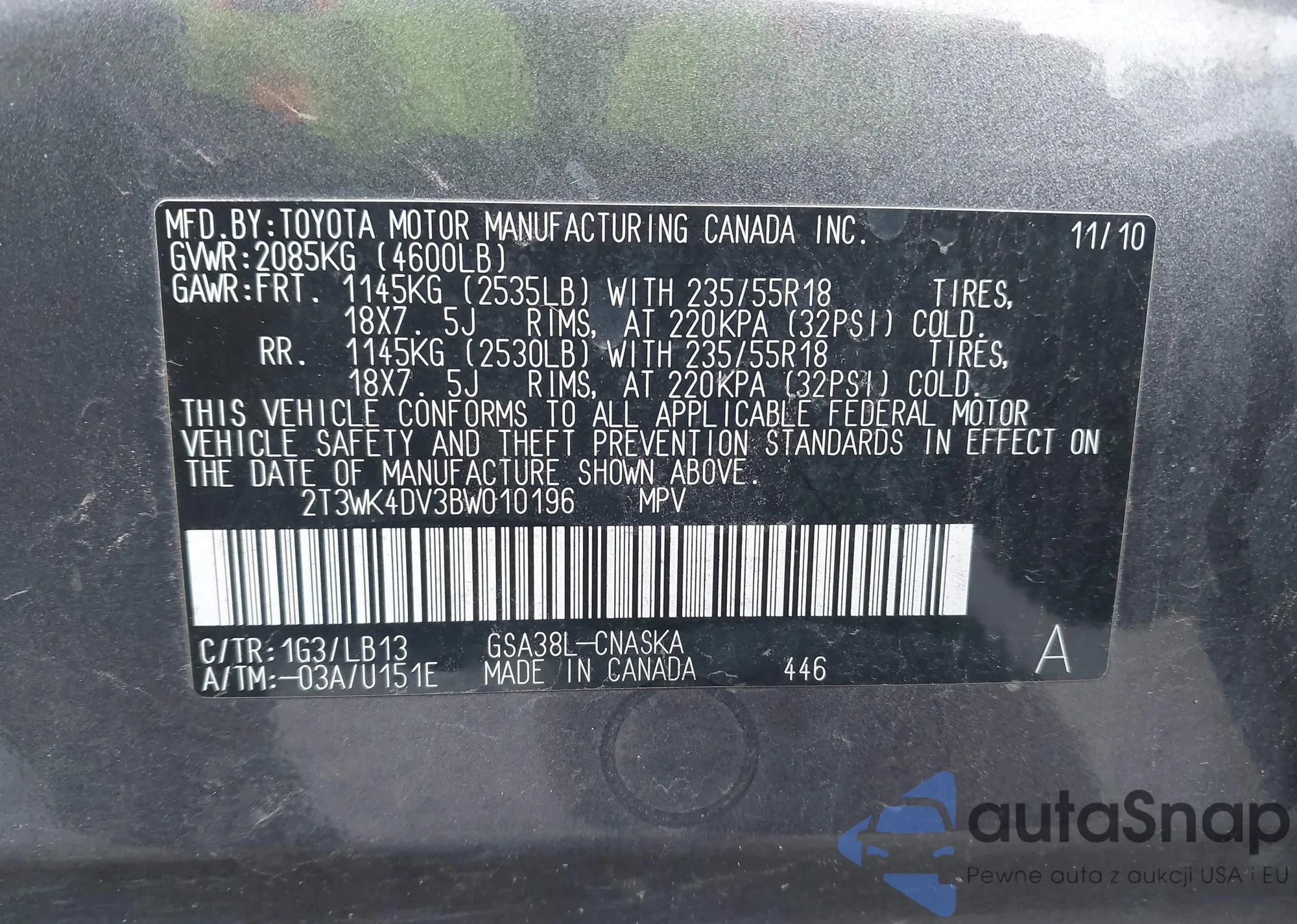 • VIN 2T3WK4DV3BW010196