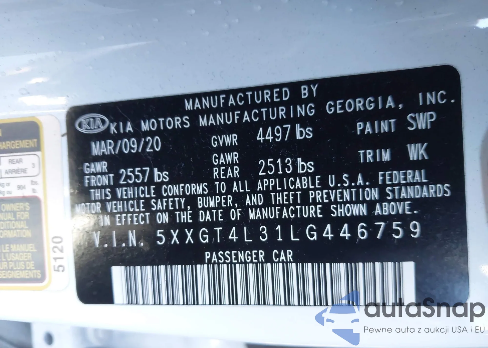 LOT: 44128059 VIN: 5XXGT4L31LG446759