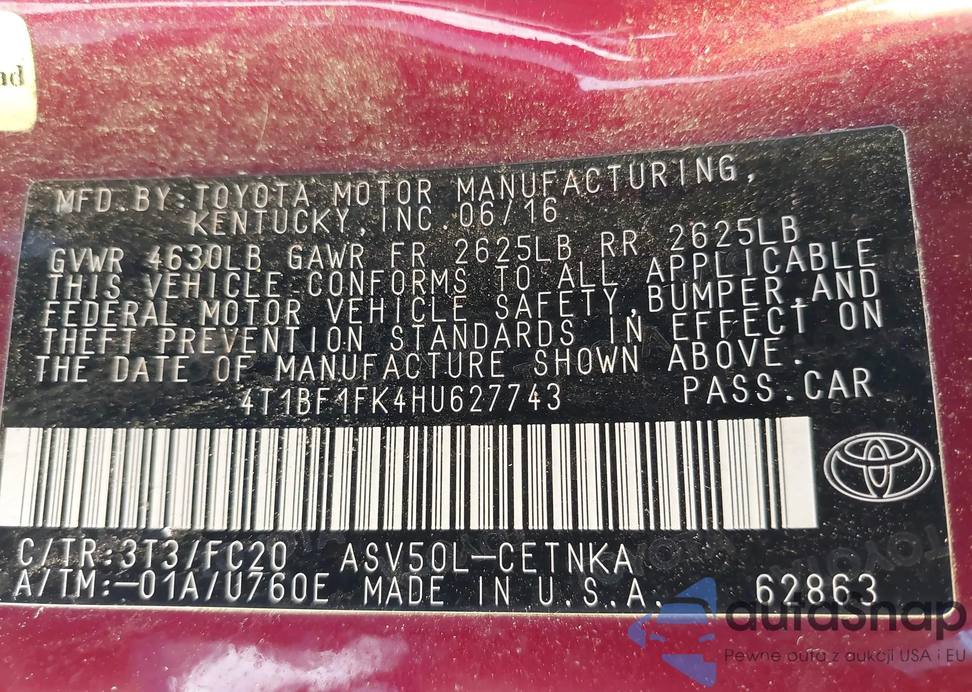 • VIN 4T1BF1FK4HU627743