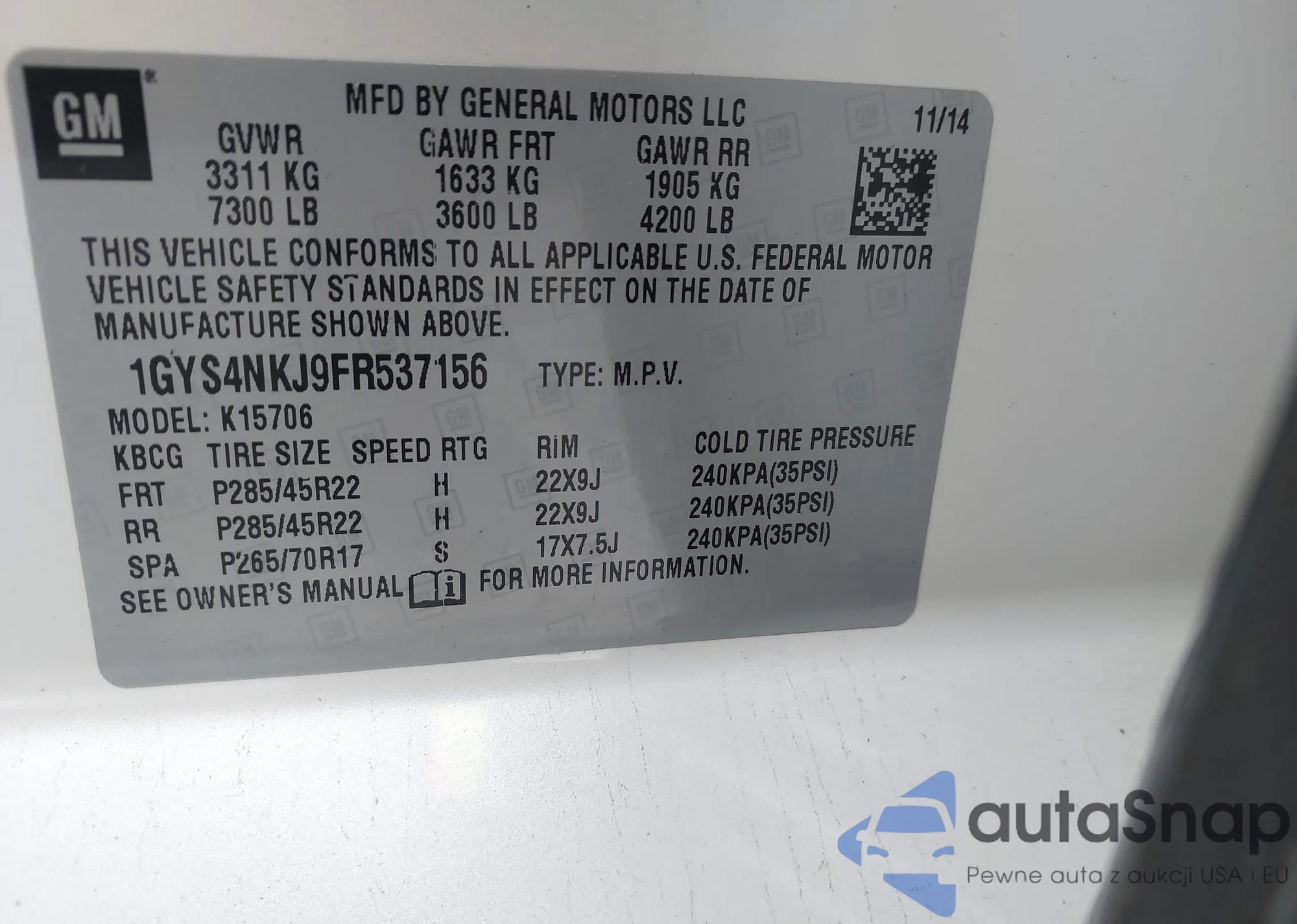 • VIN 1GYS4NKJ9FR537156