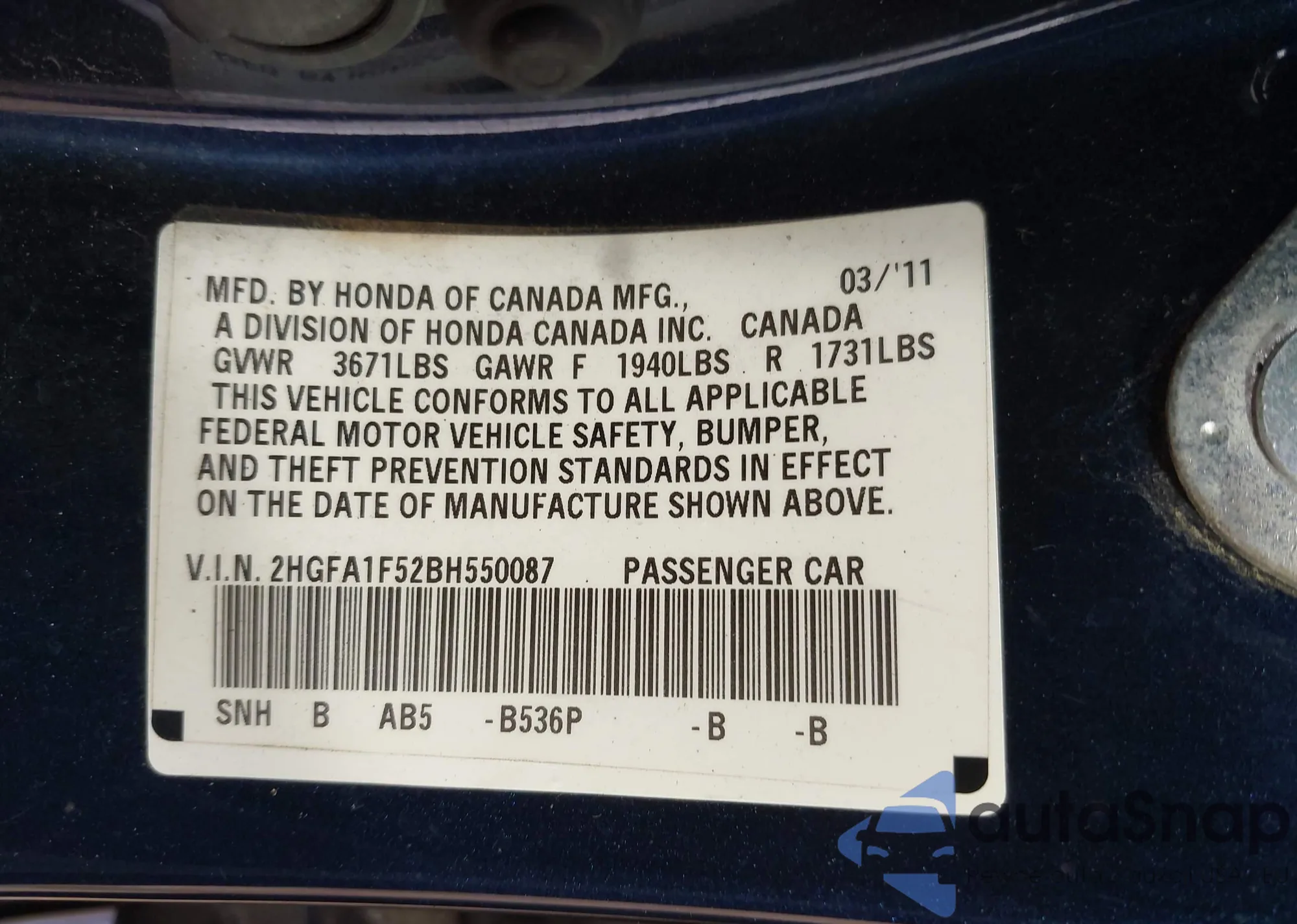 • VIN 2HGFA1F52BH550087