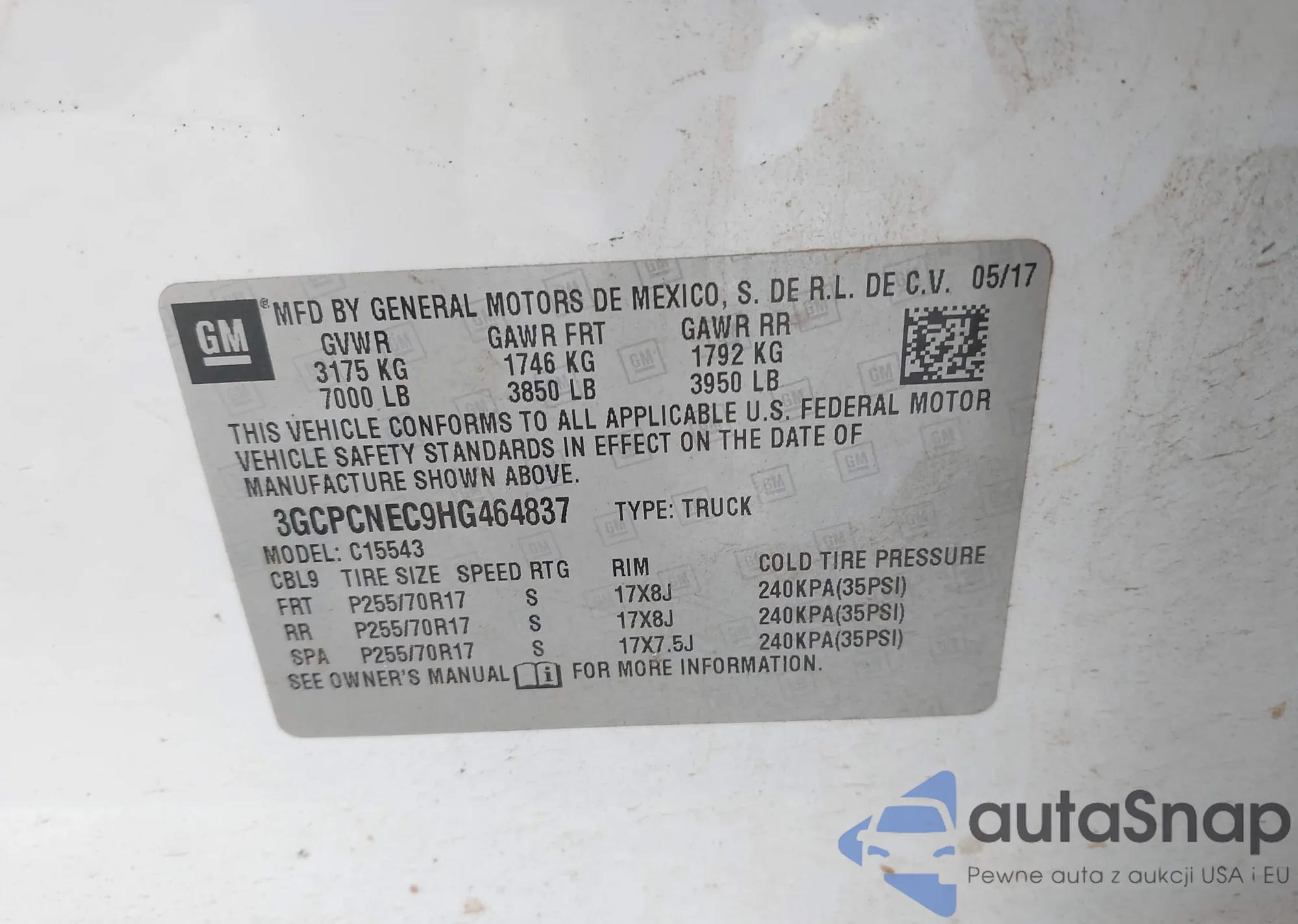 LOT: 43838490 VIN: 3GCPCNEC9HG464837
