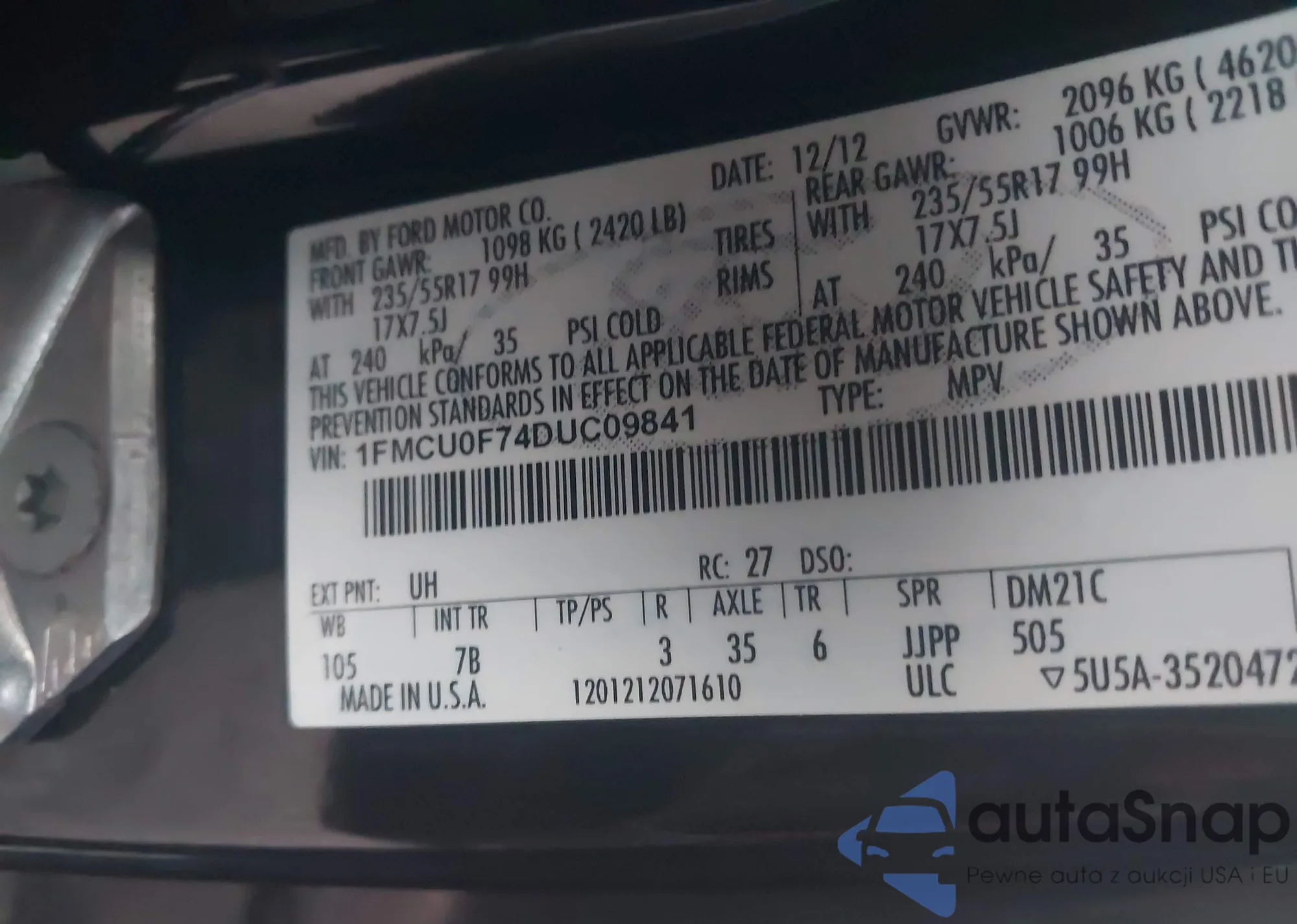 • VIN 1FMCU0F74DUC09841