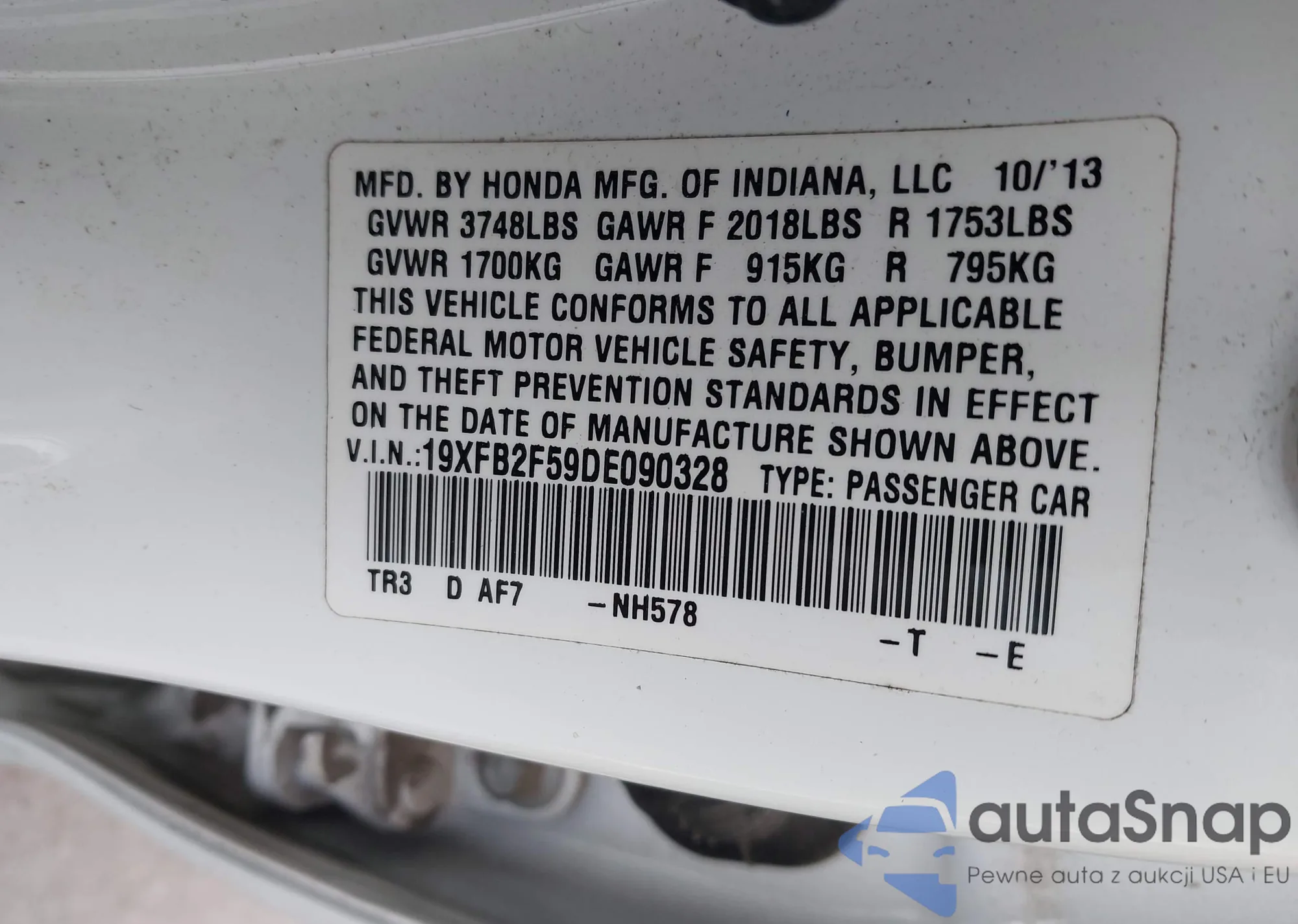 LOT: 43749619 VIN: 19XFB2F59DE090328