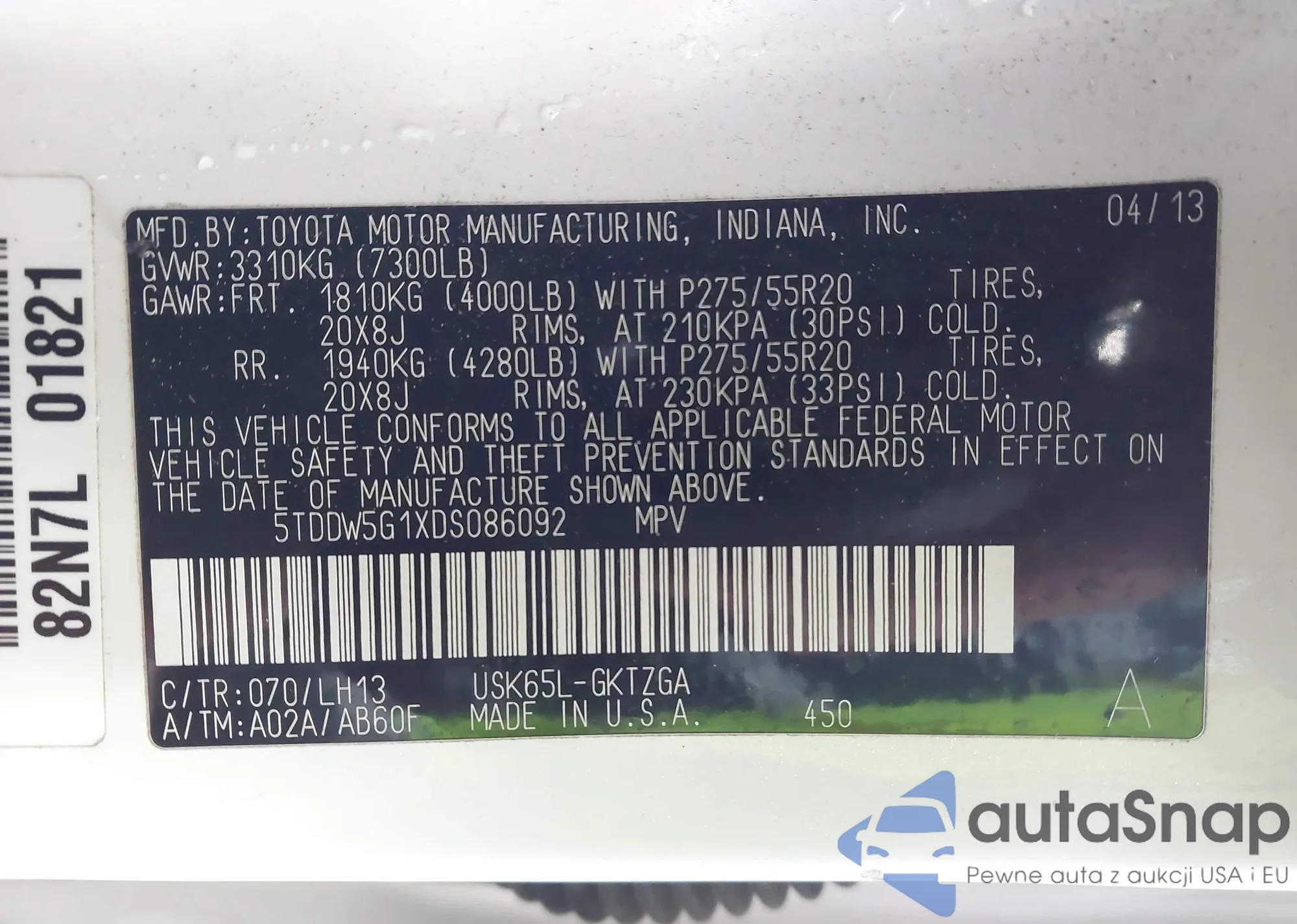 LOT: 43873468 VIN: 5TDDW5G1XDS086092