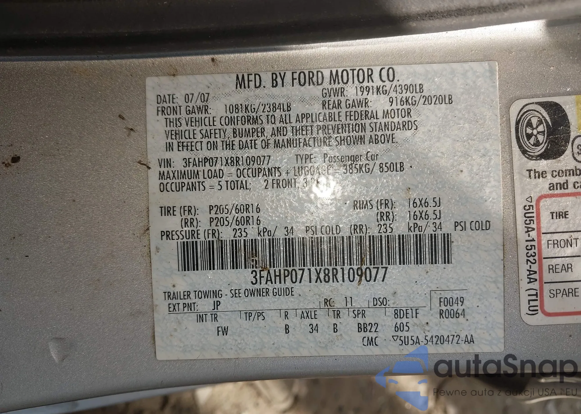 • VIN 3FAHP071X8R109077