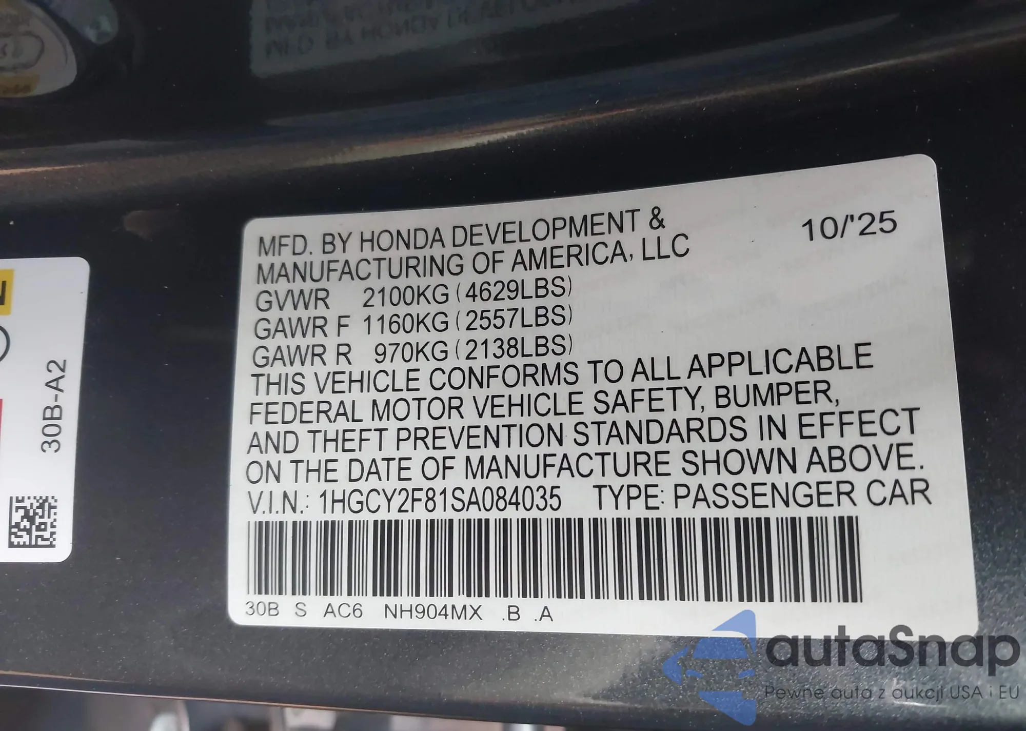 LOT: 44183011 VIN: 2HGFG21559H702708