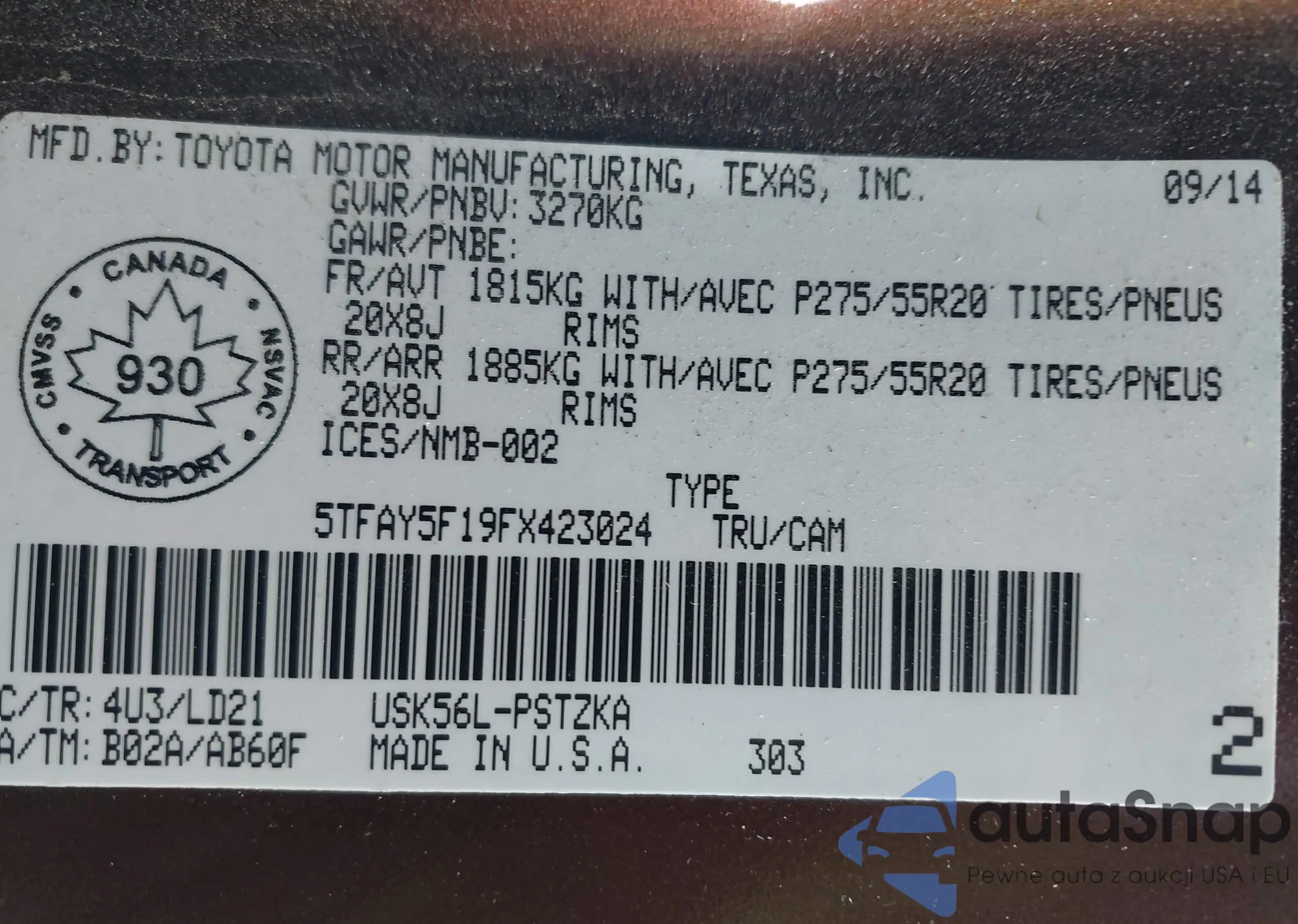 LOT: 43929996 VIN: 5TFAY5F19FX423024