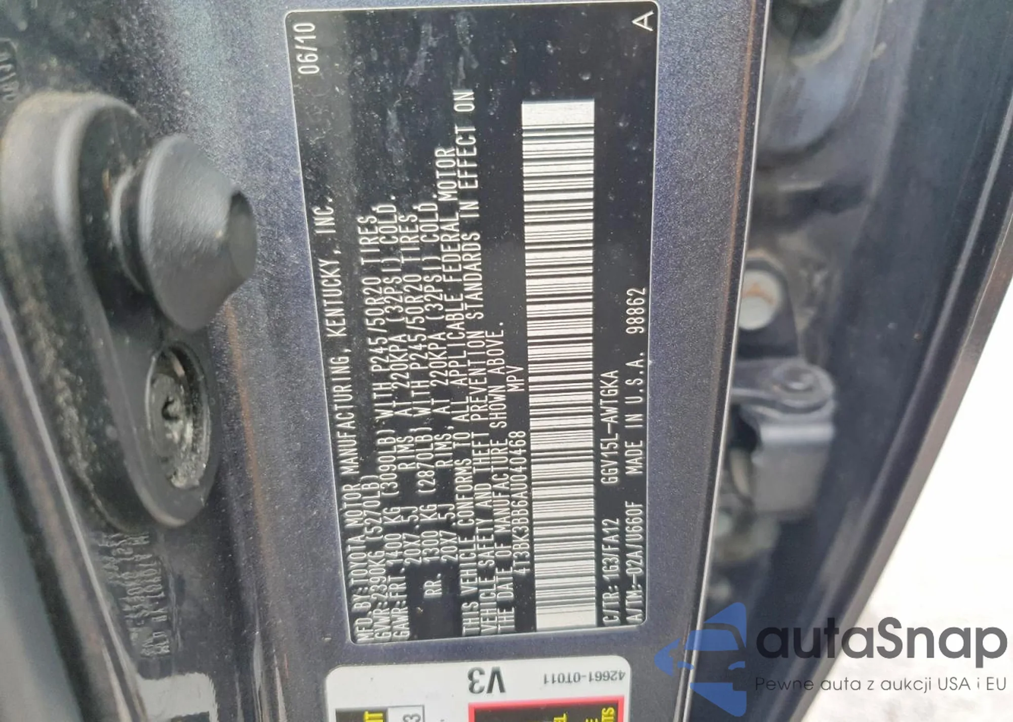 • VIN 4T3BK3BB6AU040468