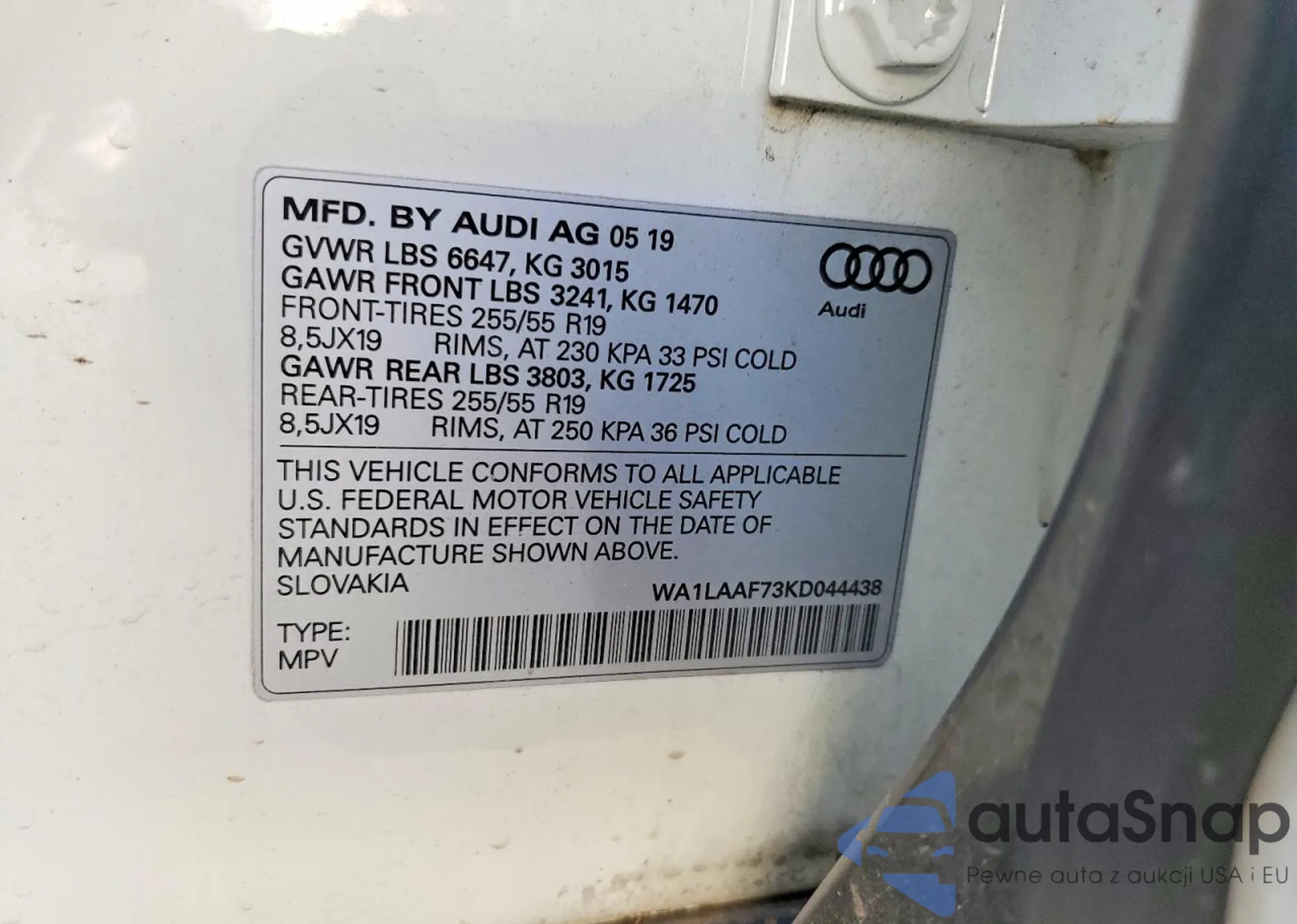LOT: 99835385 VIN: WA1LAAF73KD044438
