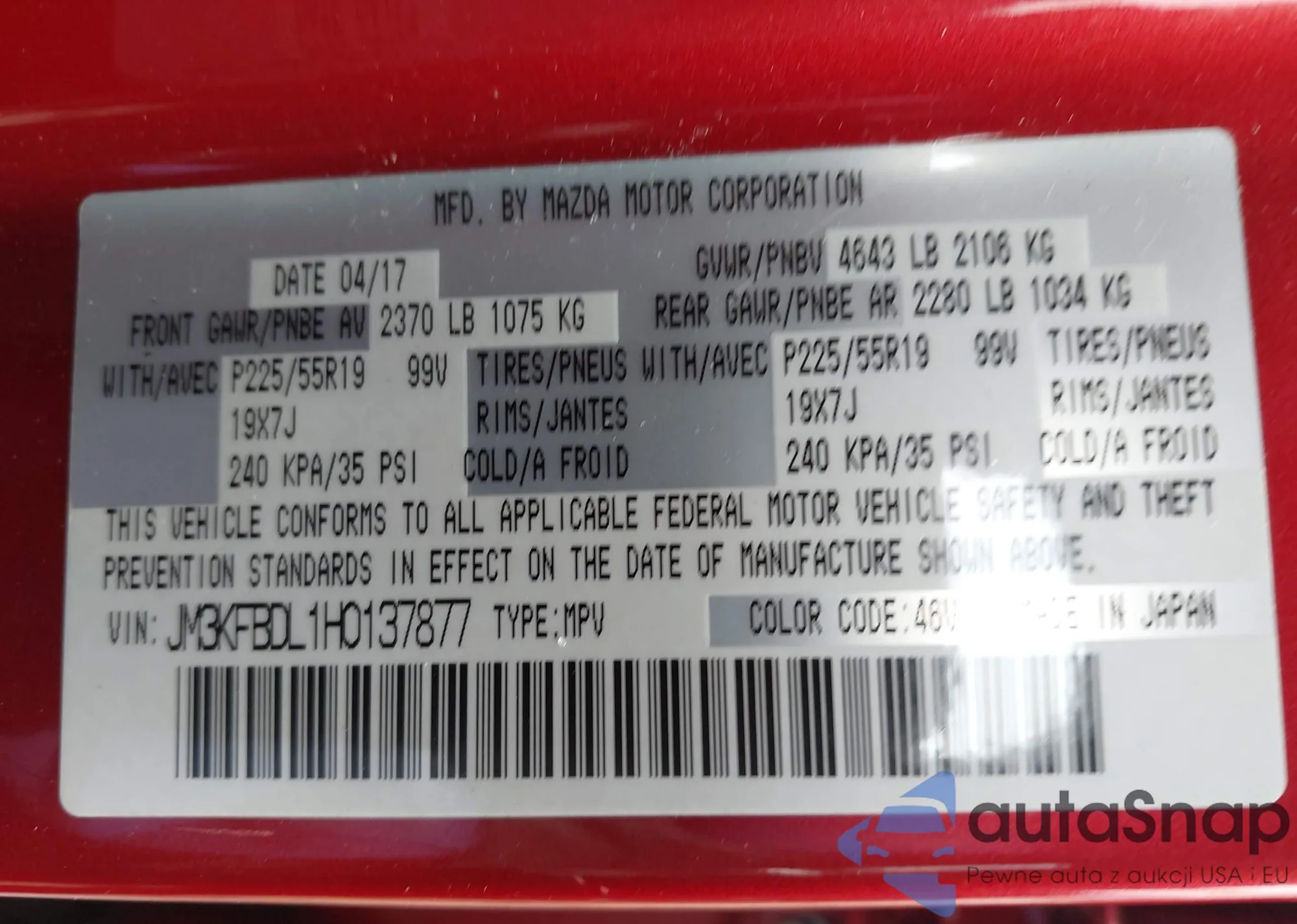 LOT: 44054239 VIN: JM3KFBDL1H0137877