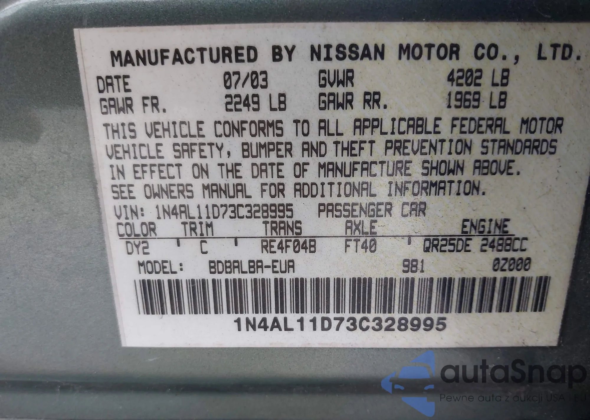 • VIN 1N4AL11D73C328995