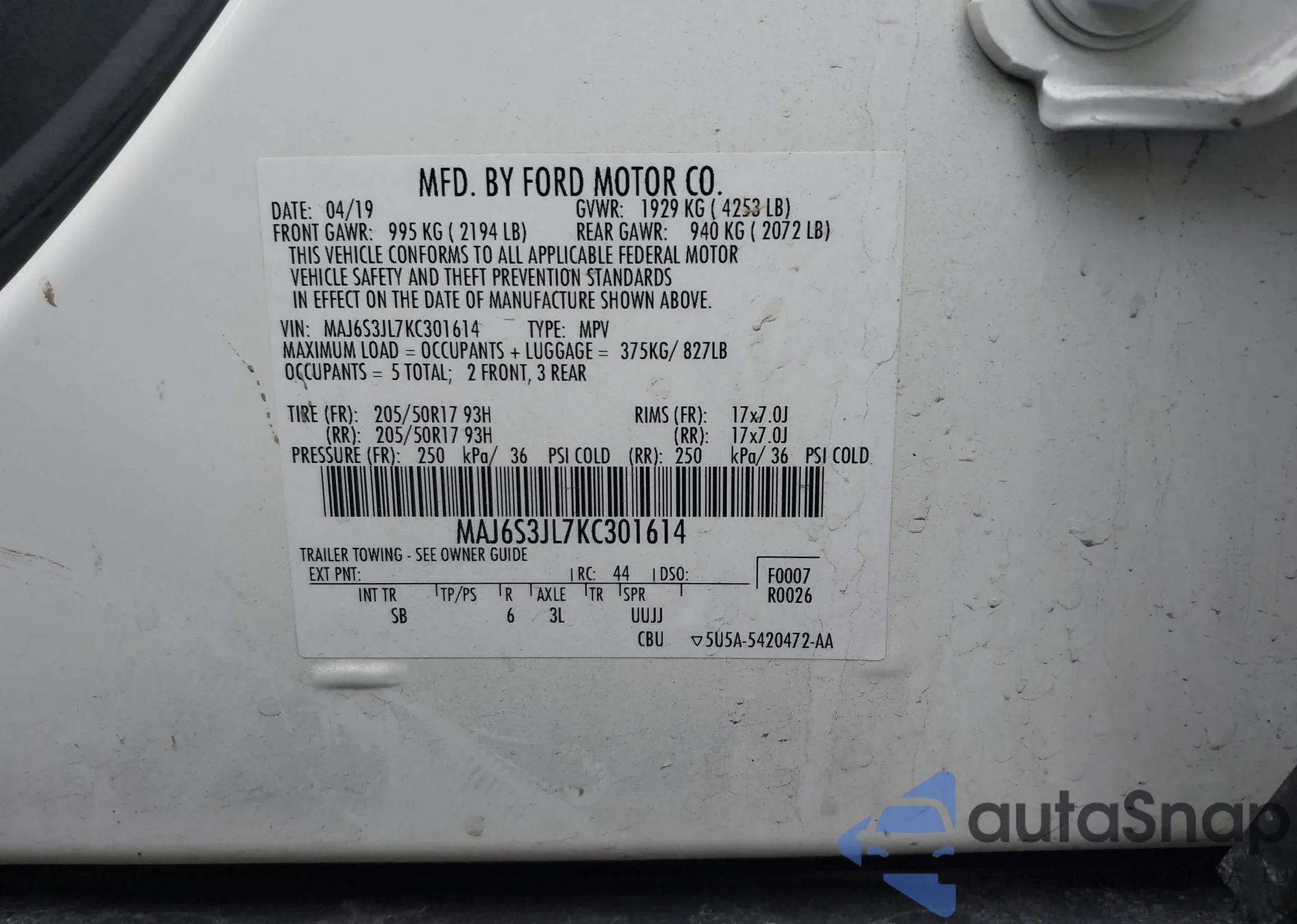 • VIN MAJ6S3JL7KC301614