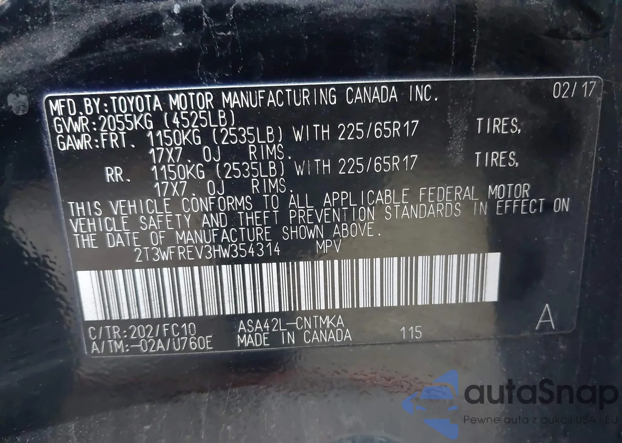• VIN 2T3WFREV3HW354314