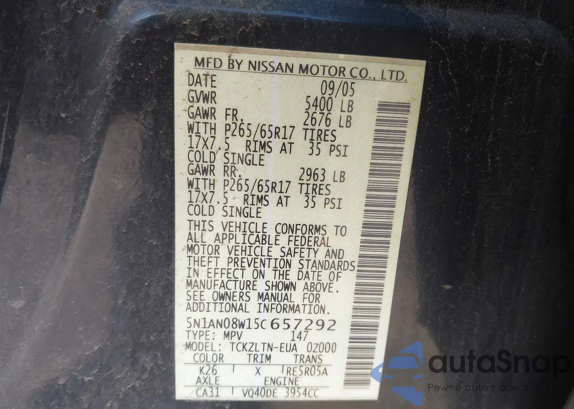 • VIN 5N1AN08W15C657292