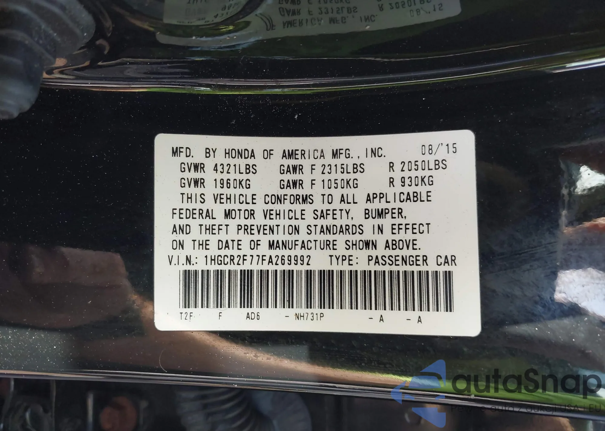 • VIN 1HGCR2F77FA269992