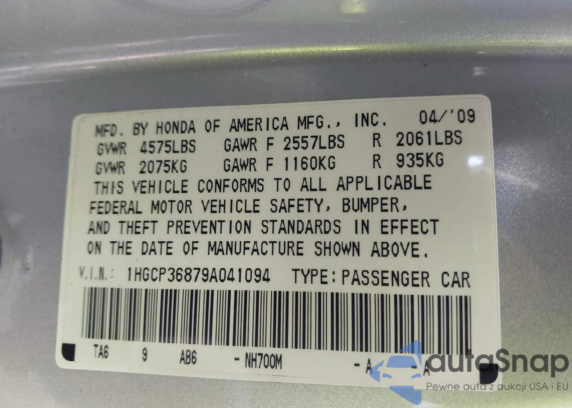 LOT: 44106709 VIN: 1HGCP36879A041094