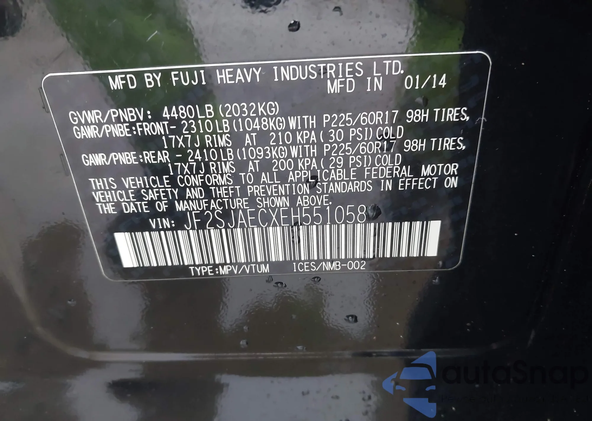 • VIN JF2SJAECXEH551058