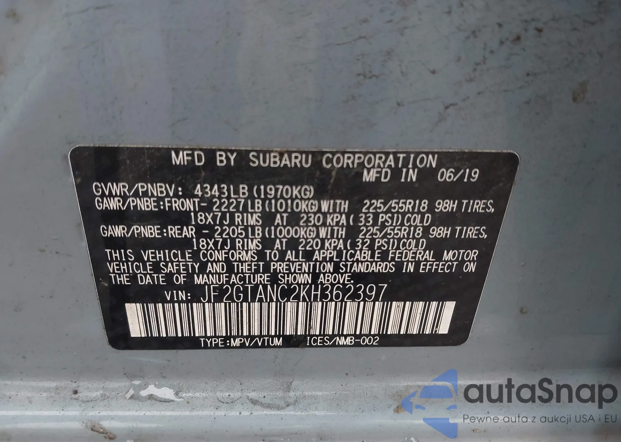 • VIN JF2GTANC2KH362397