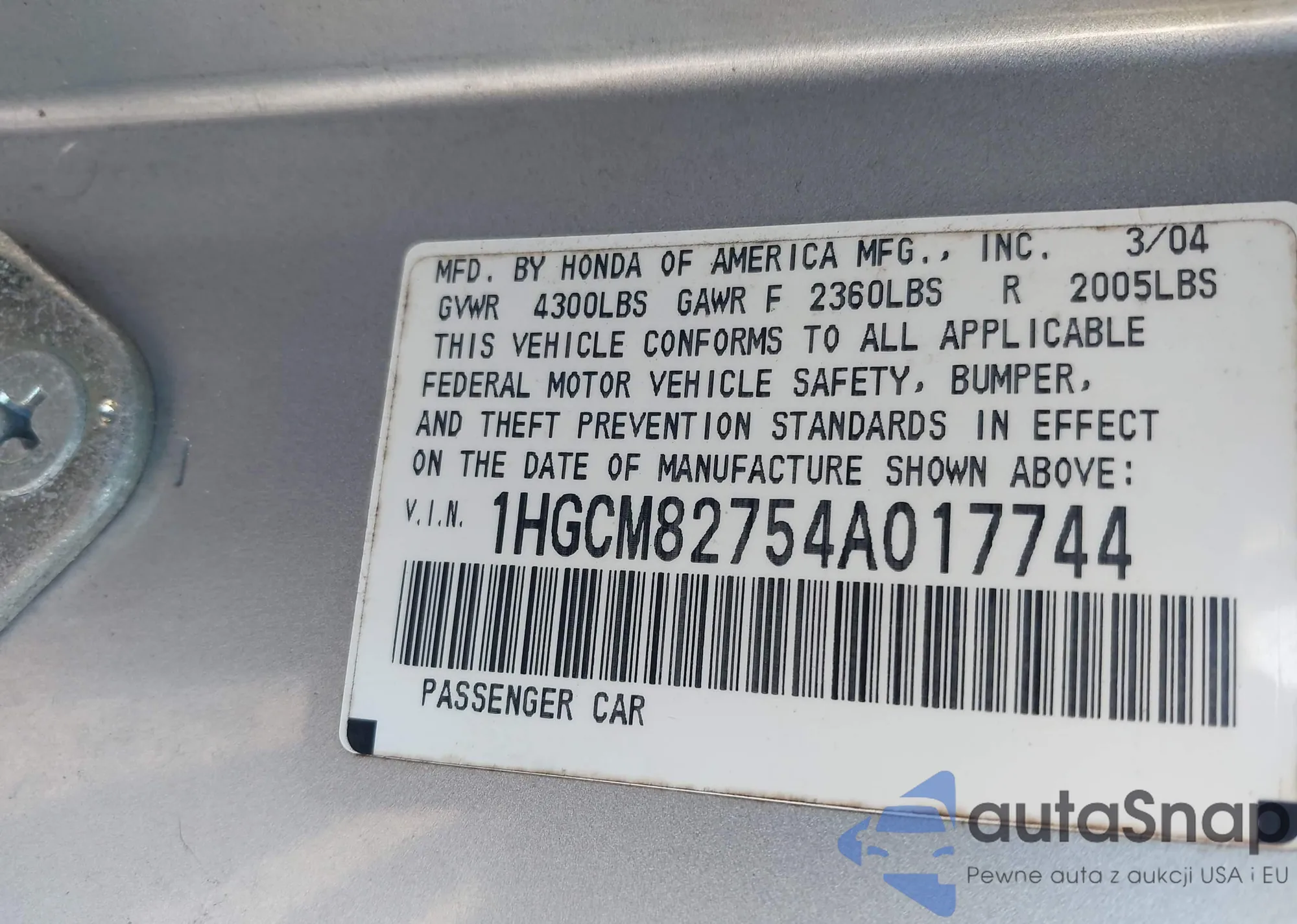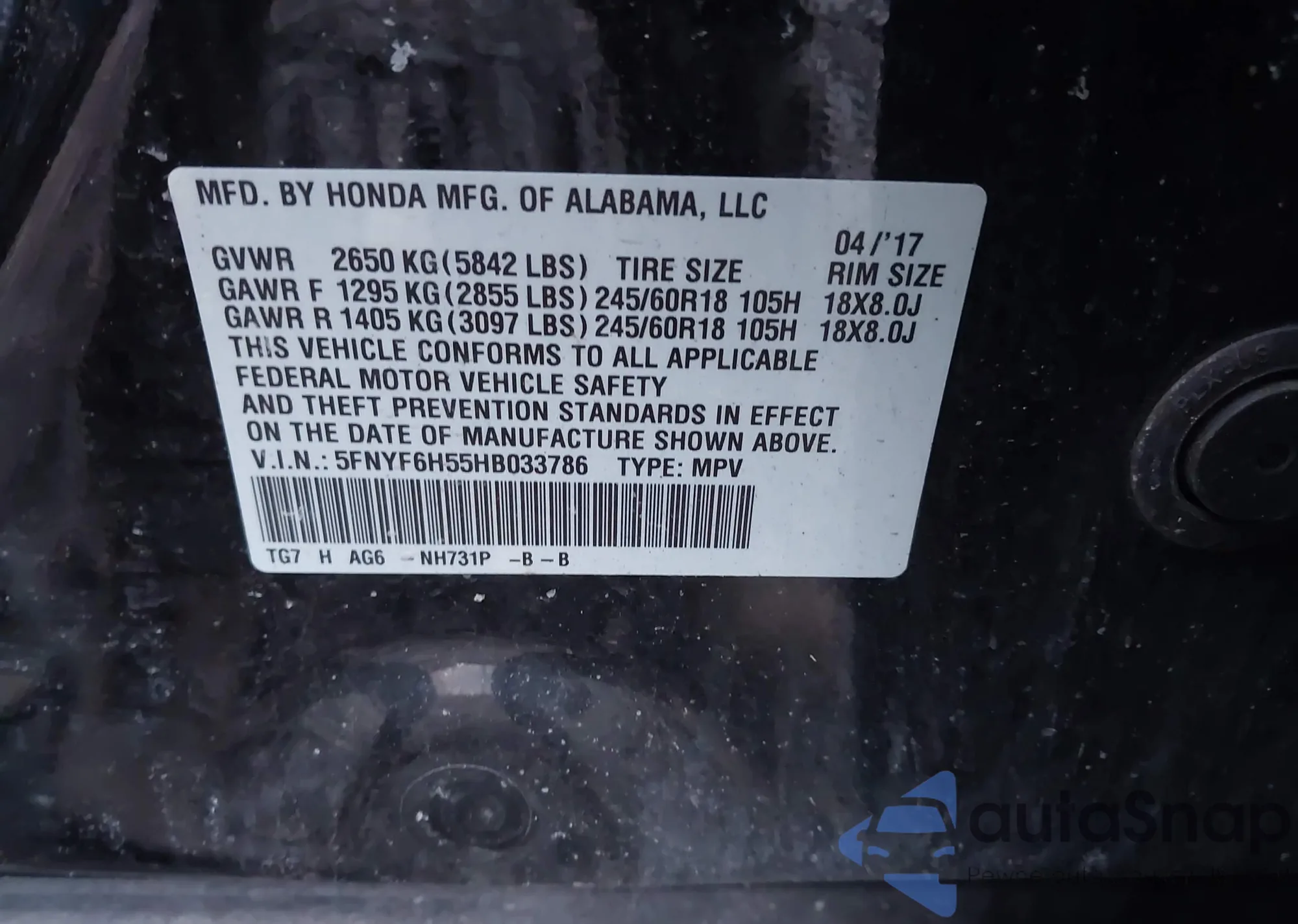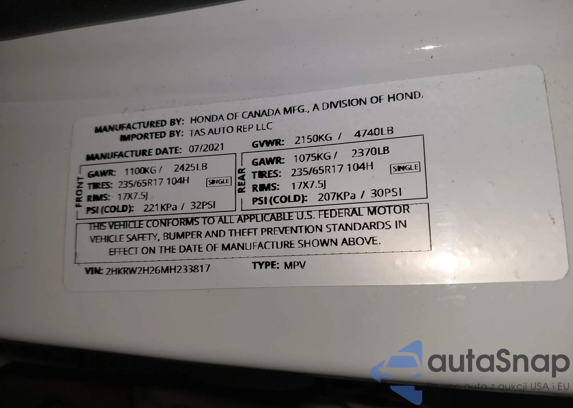 • VIN 2HKRW2H26MH233817