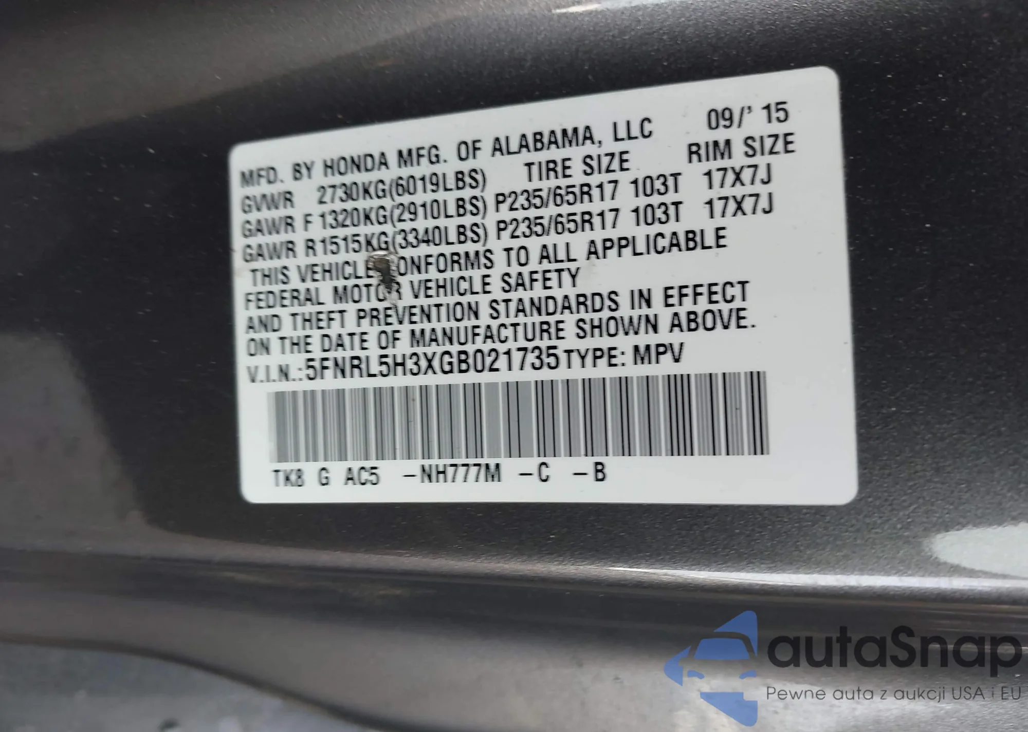 • VIN 5FNRL5H3XGB021735