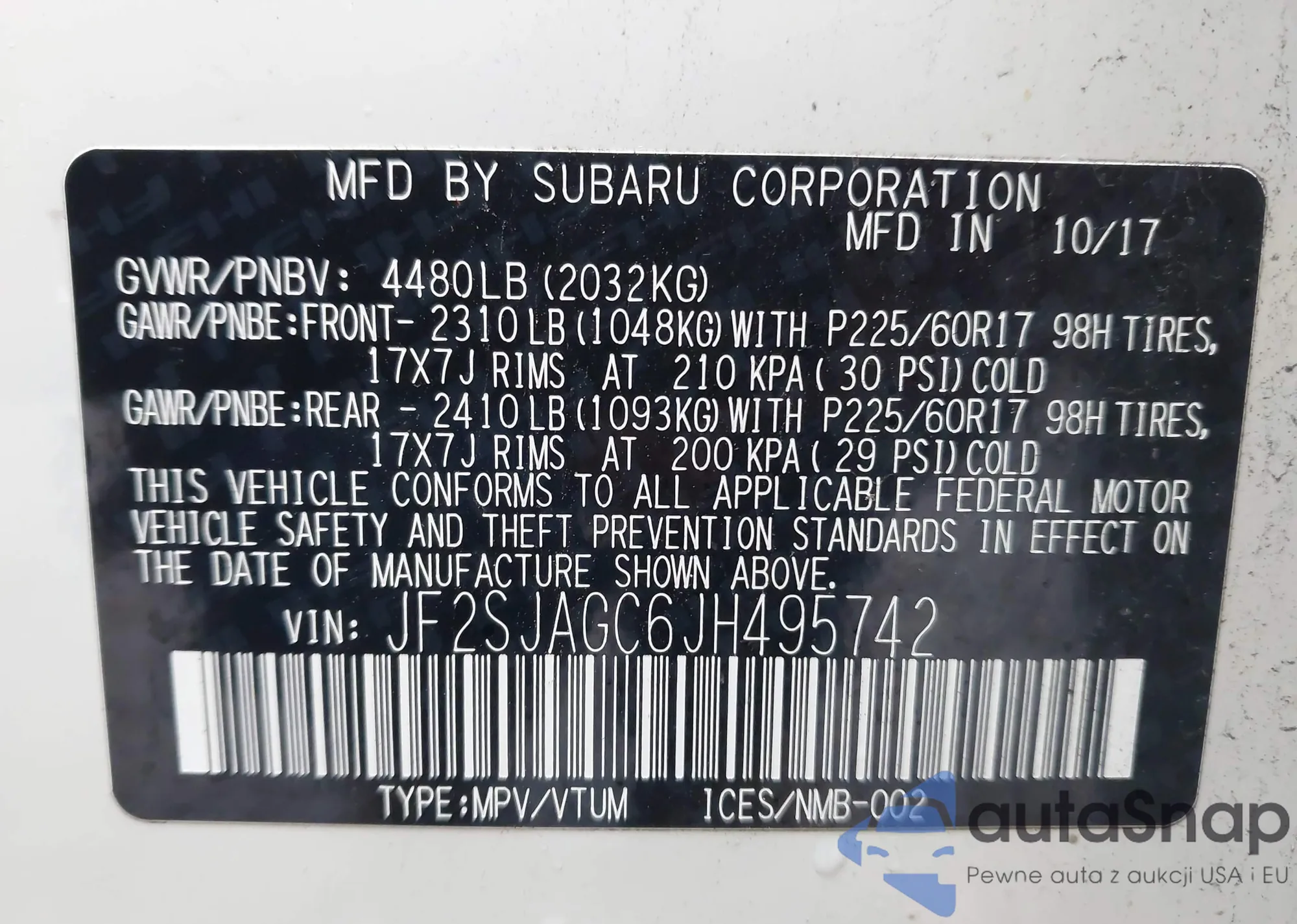 LOT: 44086042 VIN: JF2SJAGC6JH495742