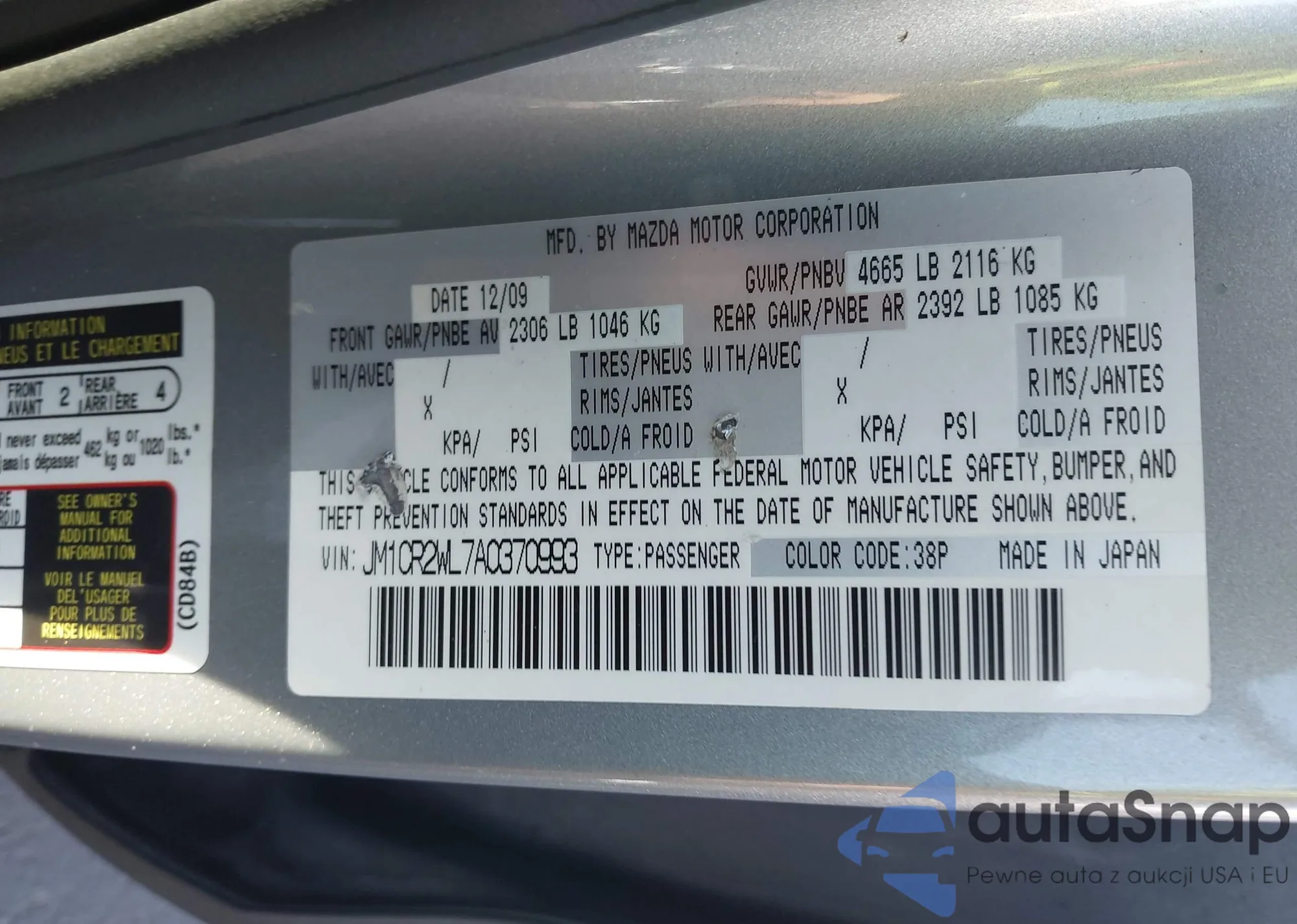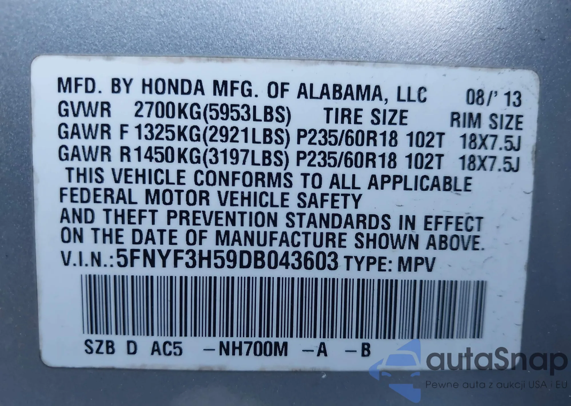 • VIN 5FNYF3H59DB043603