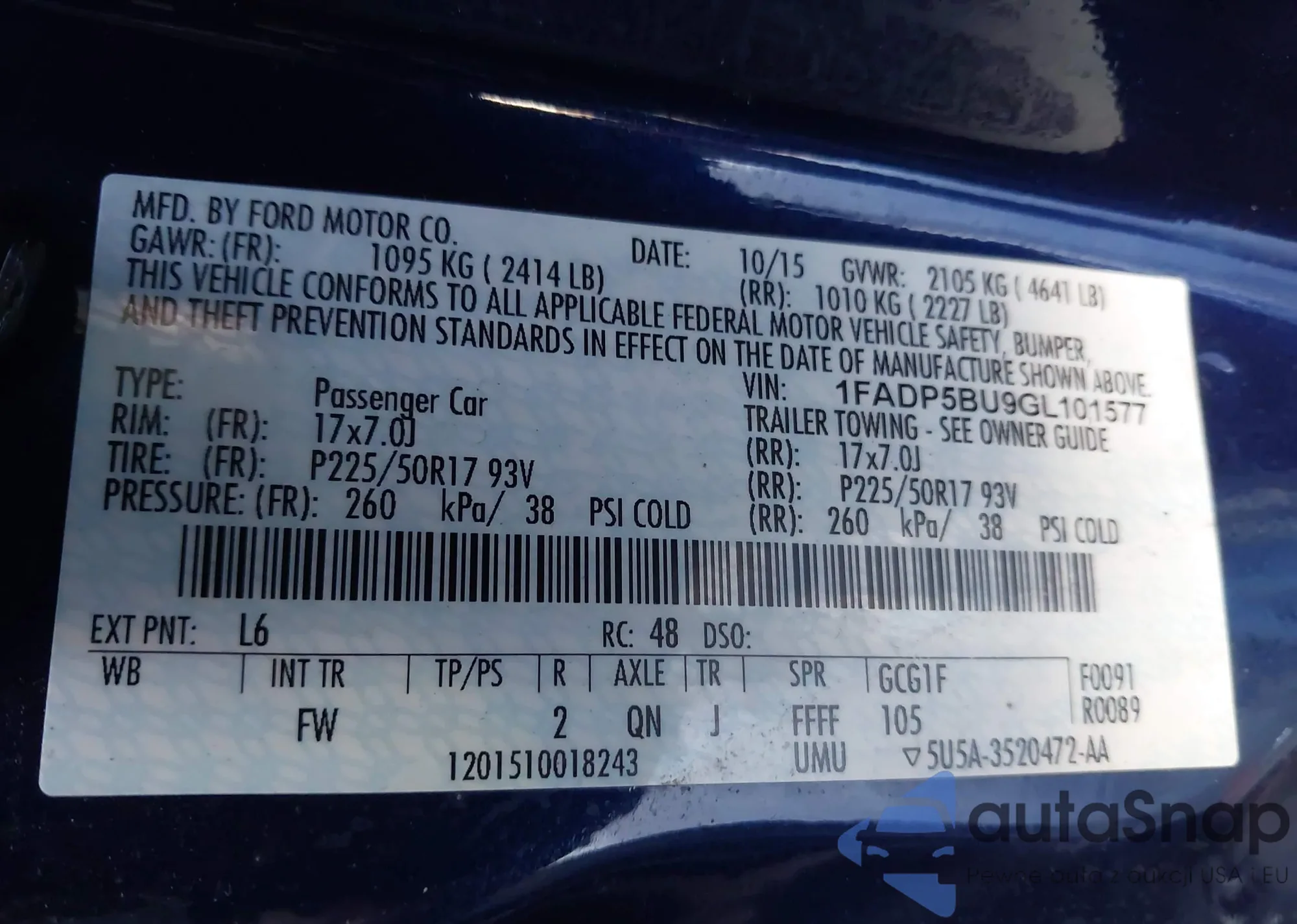 • VIN 1FADP5BU9GL101577