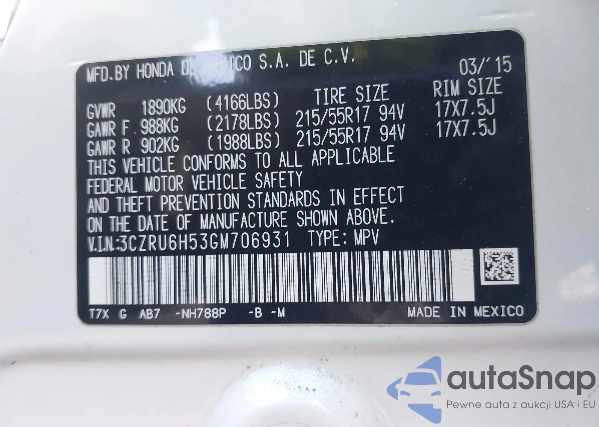 • VIN 3CZRU6H53GM706931