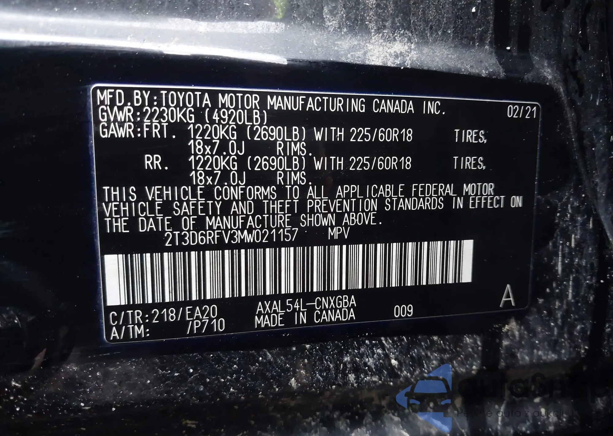 • VIN 2T3D6RFV3MW021157