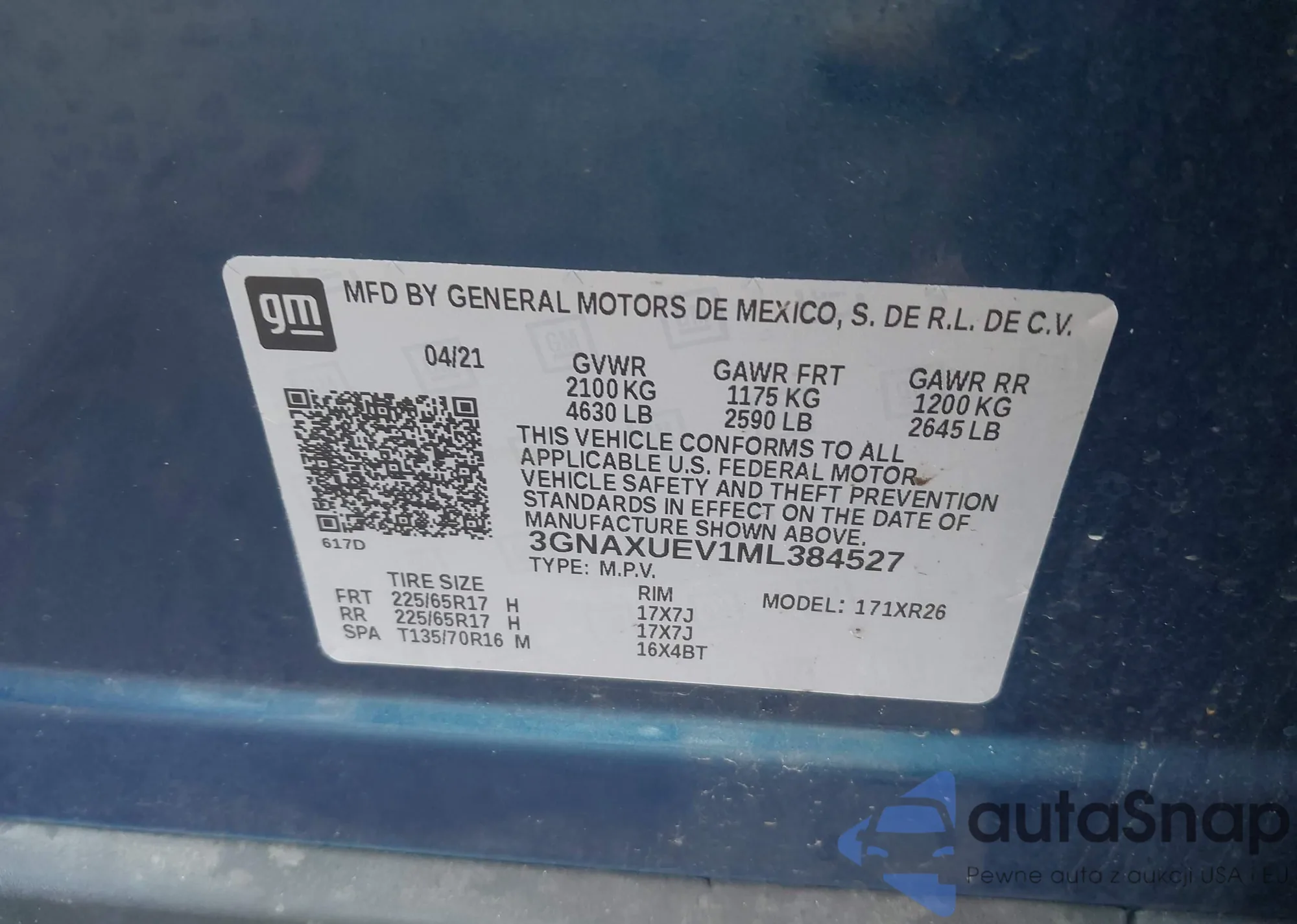LOT: 43806882 VIN: 3GNAXUEV1ML384527