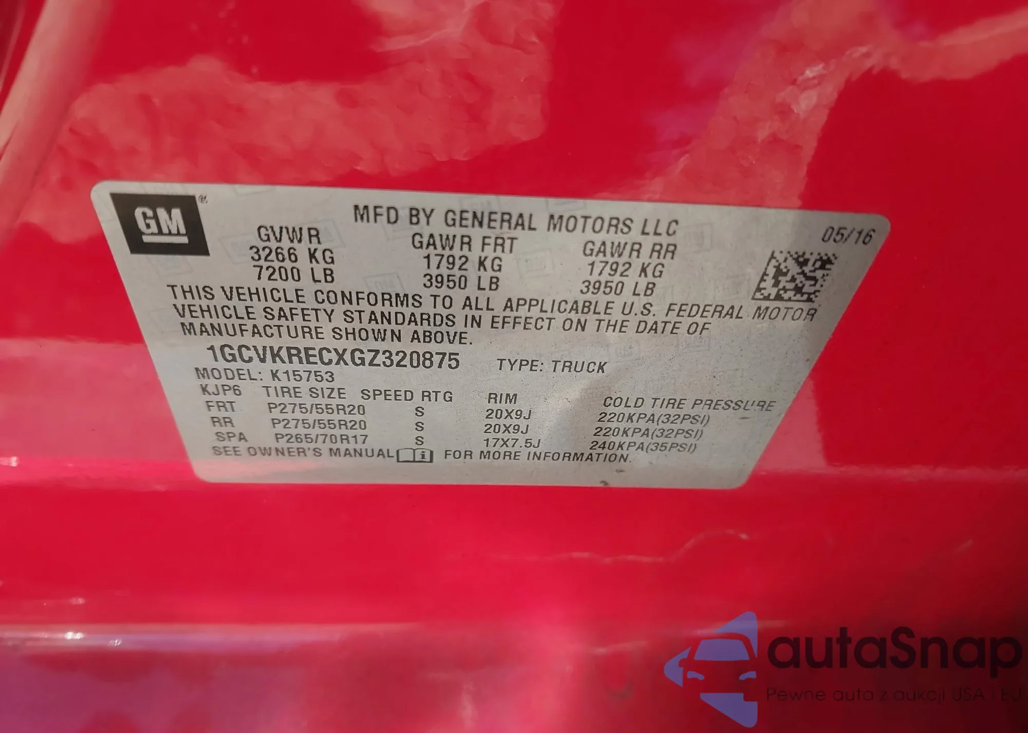 LOT: 43918987 VIN: 5XXGT4L38GG020167