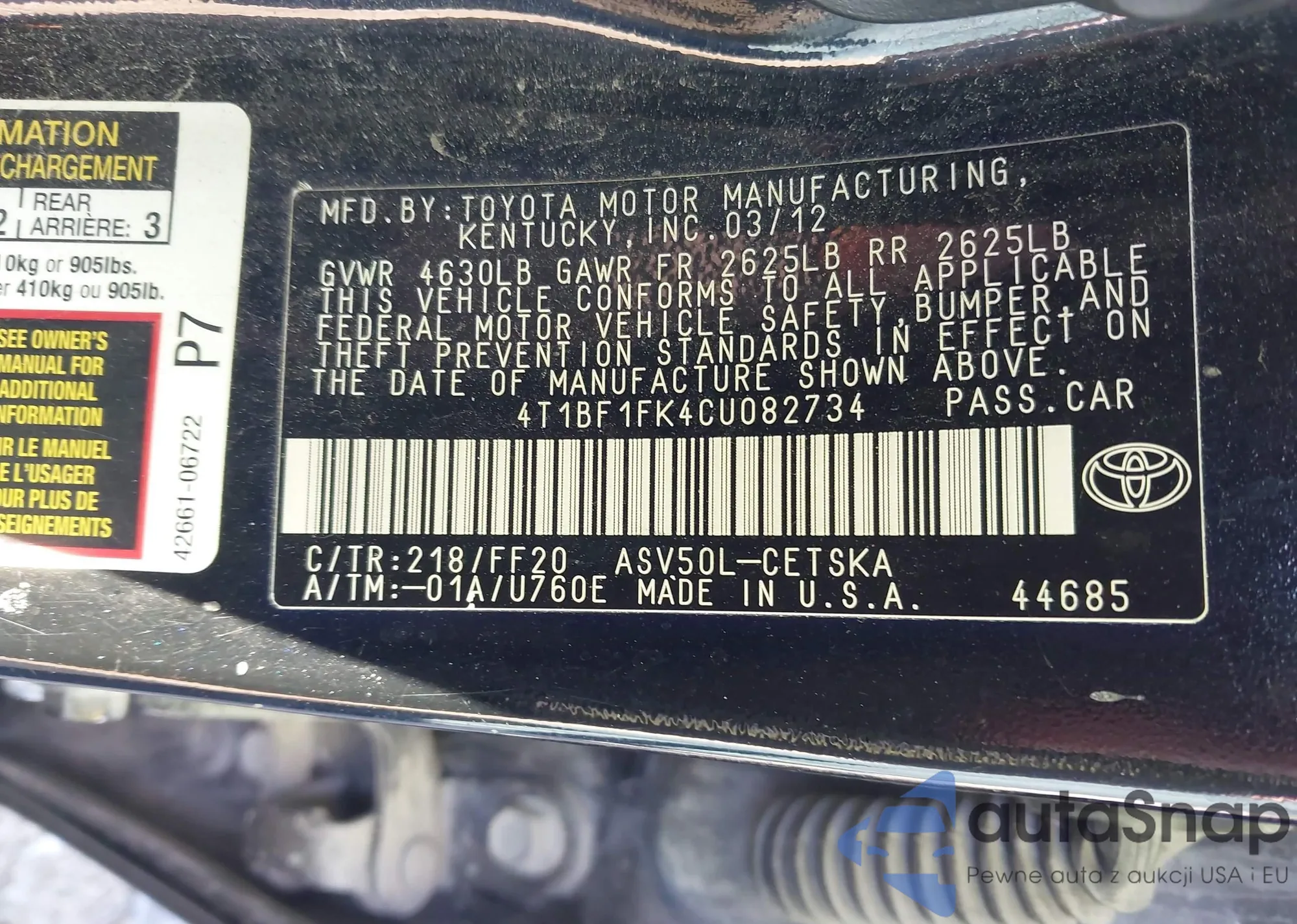 • VIN 4T1BF1FK4CU082734