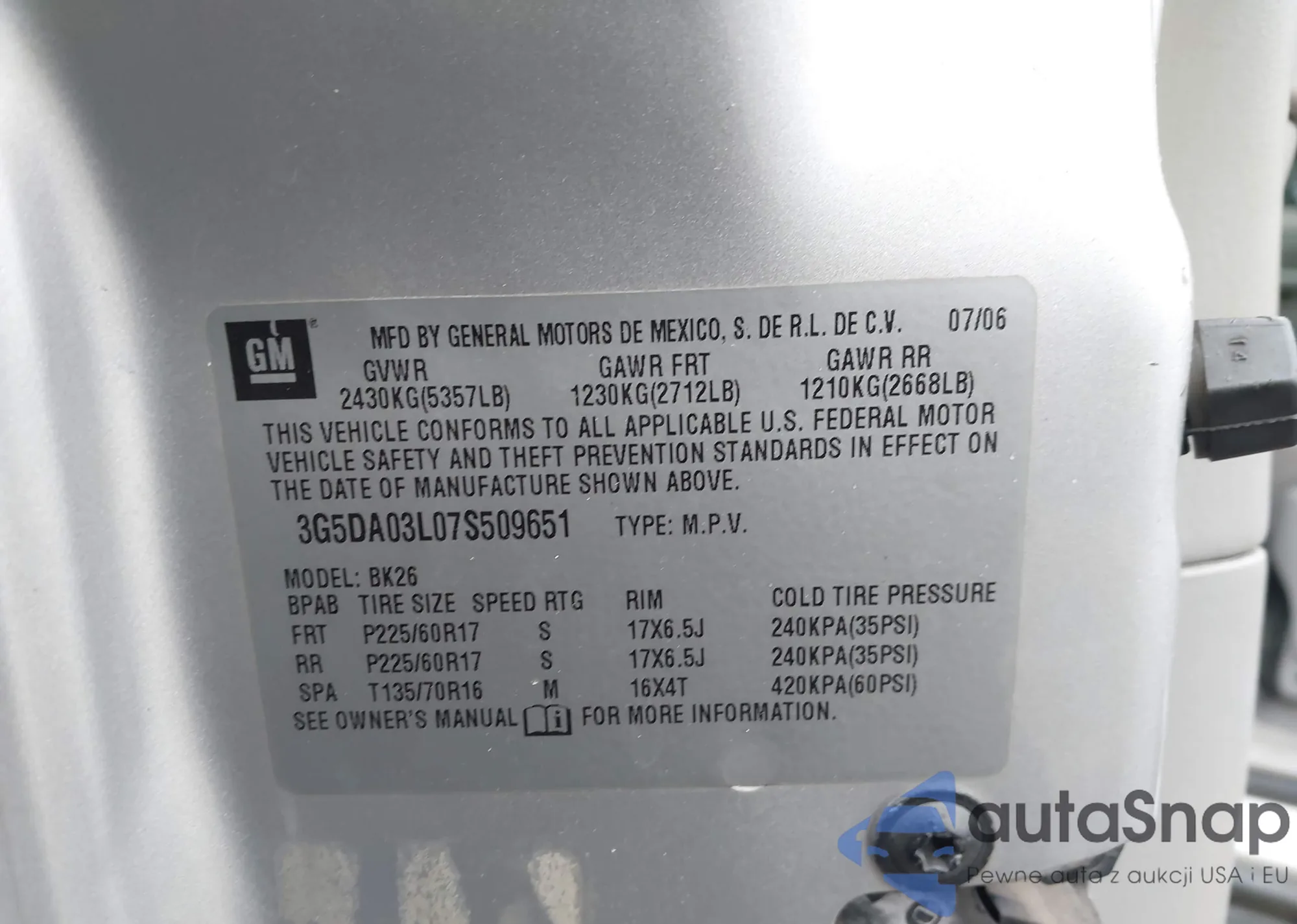 LOT: 43810082 VIN: 3G5DA03L07S509651