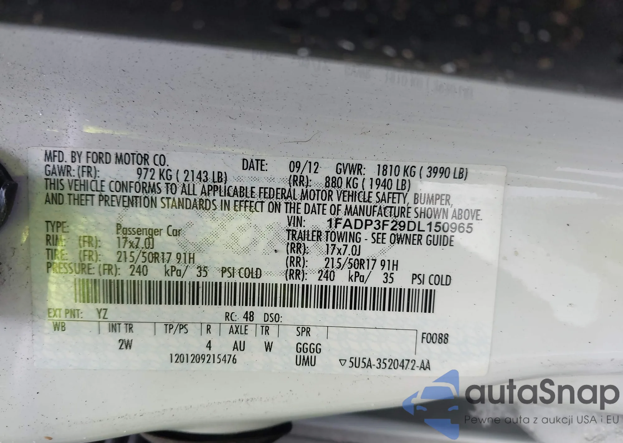 LOT: 43812750 VIN: 1FADP3F29DL150965