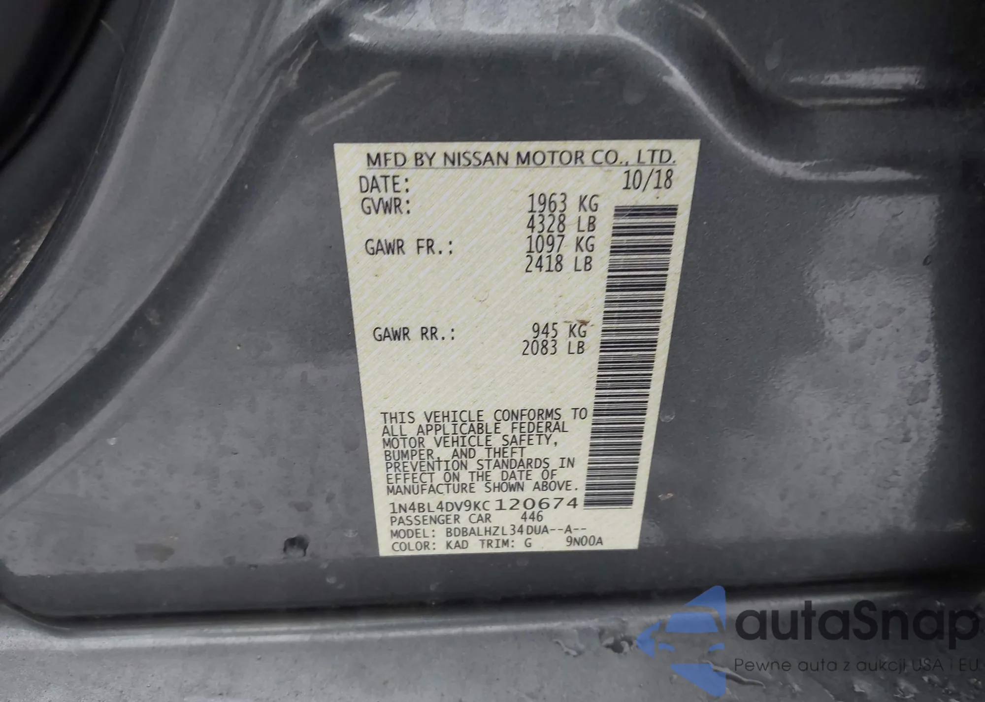 • VIN 1N4BL4DV9KC120674