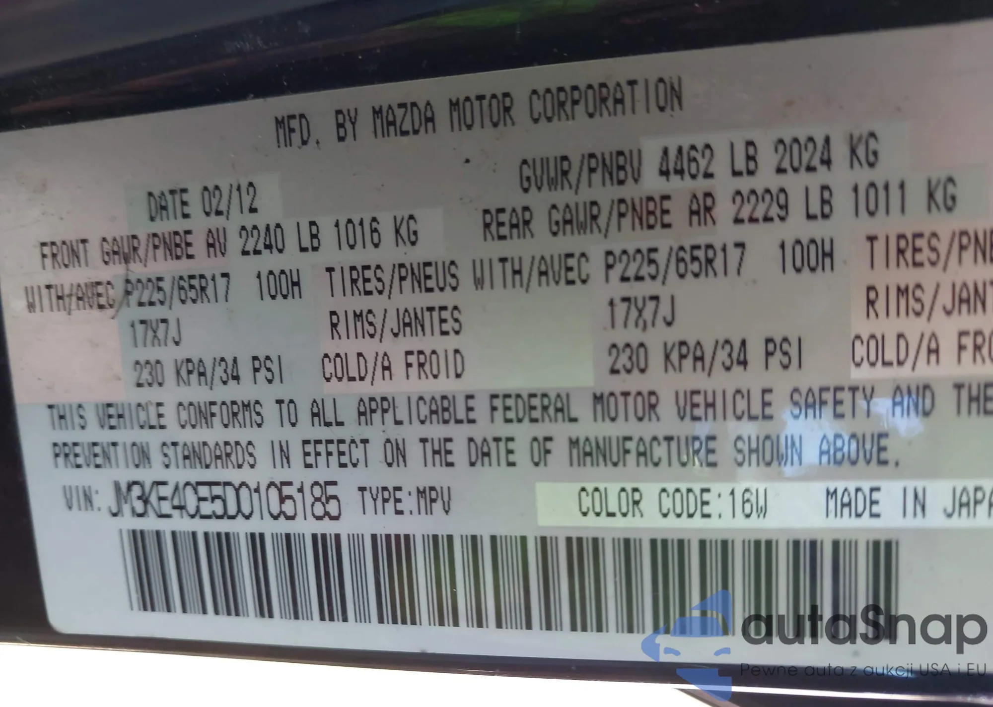 LOT: 43420516 VIN: JM3KE4CE5D0105185