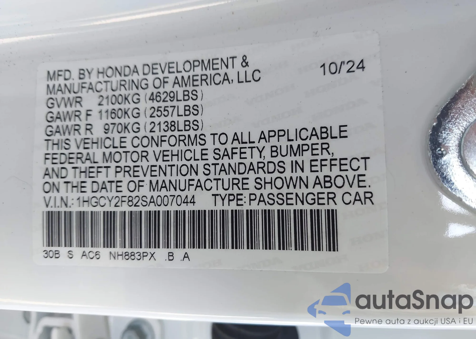 LOT: 43932496 VIN: 1HGCY2F82SA007044