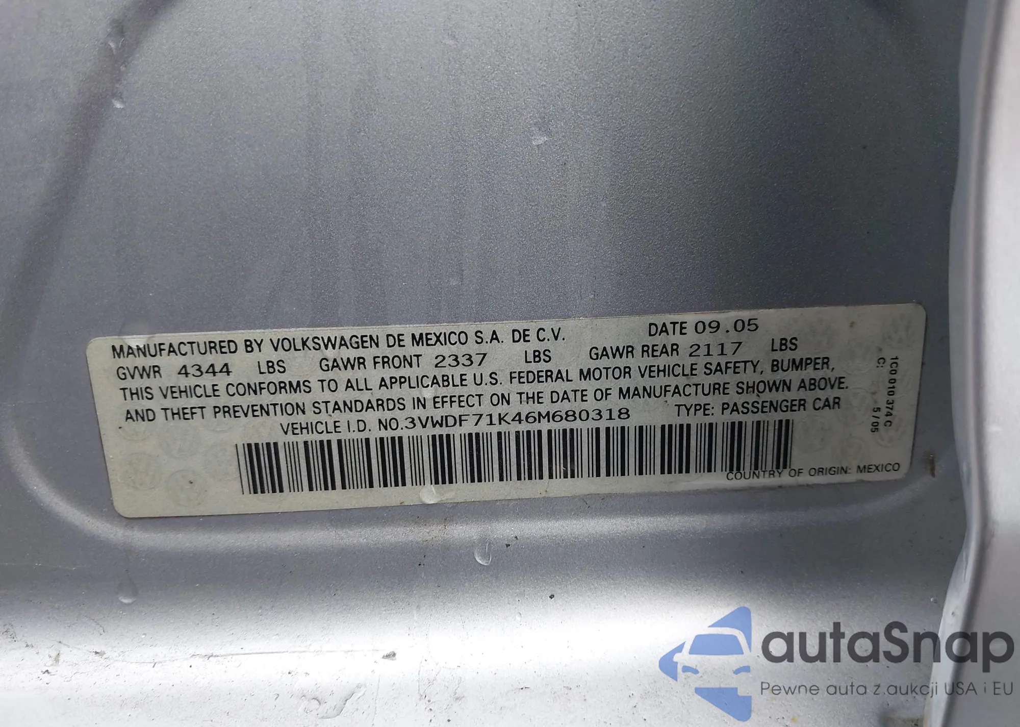• VIN 3VWDF71K46M680318