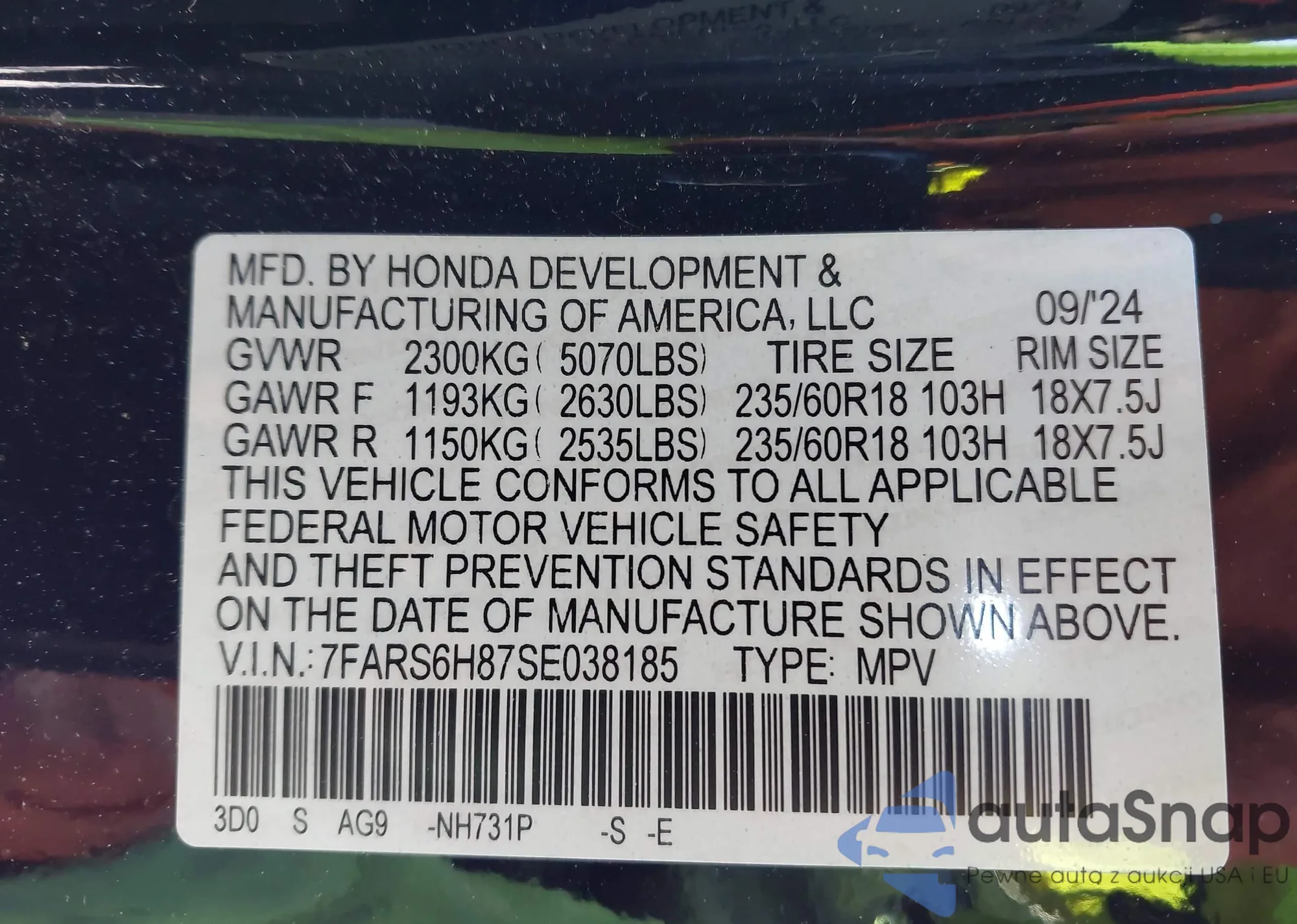 • VIN 5FPYK3F87HB035330