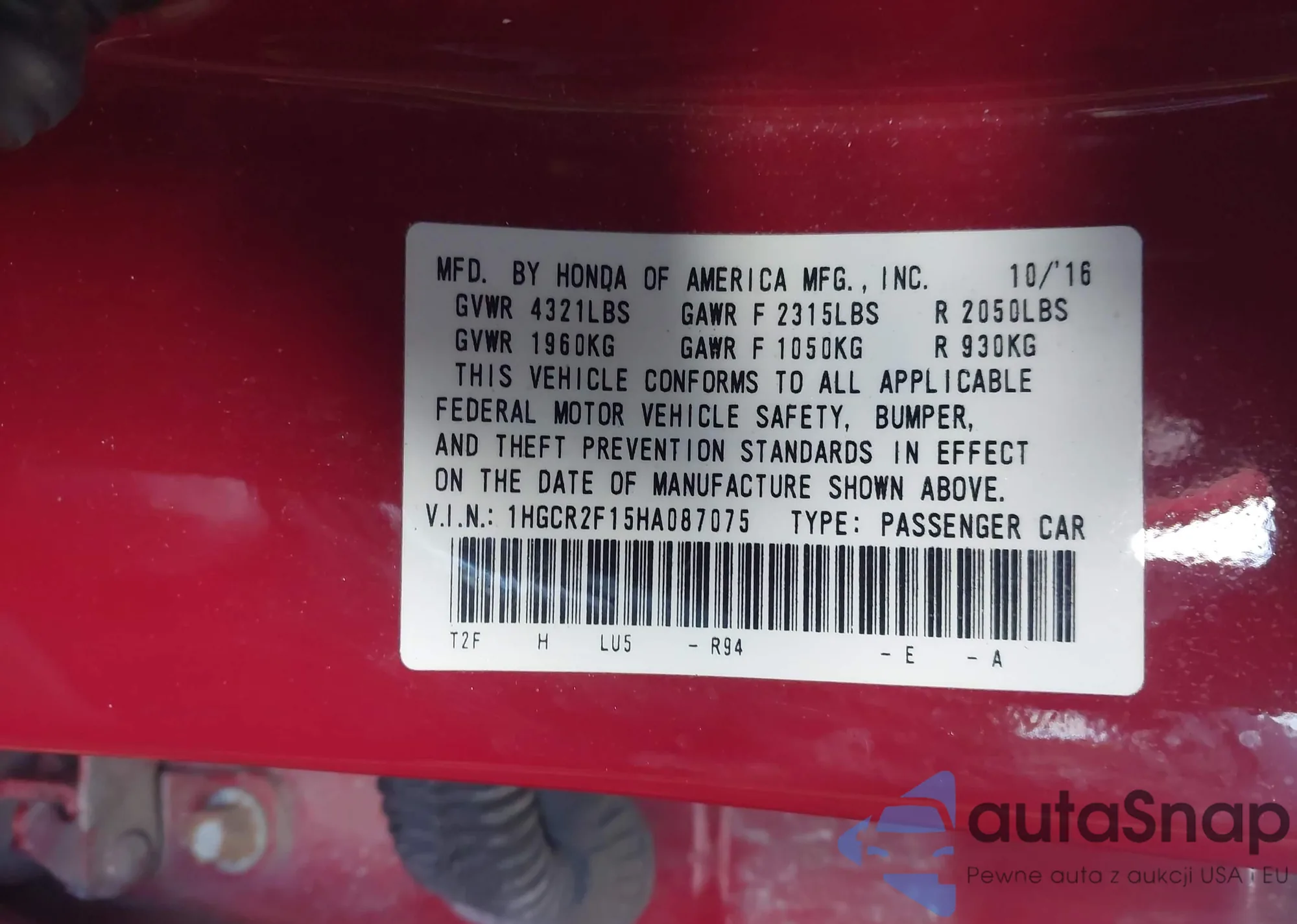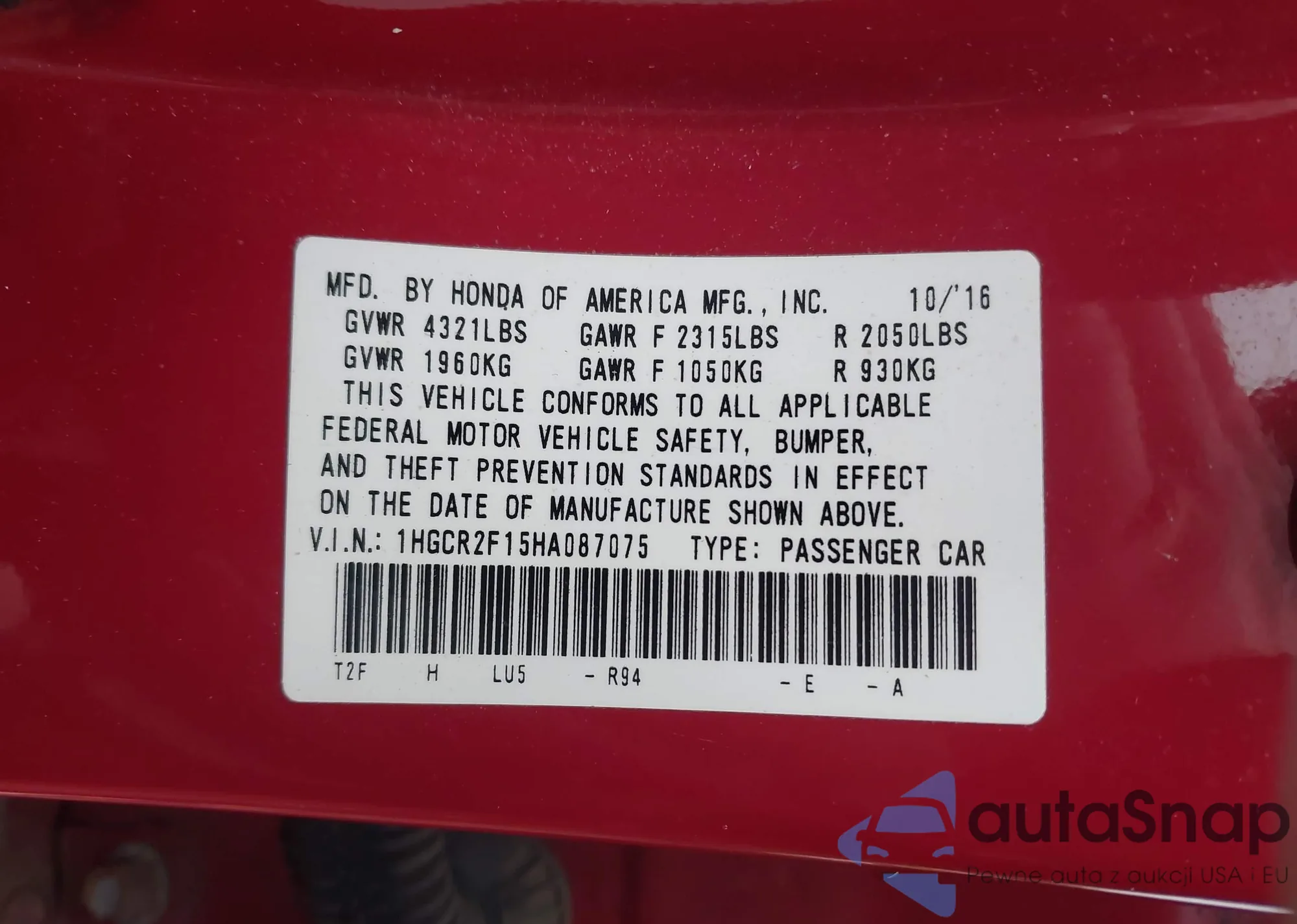 LOT: 43915282 VIN: 1HGCR2F15HA087075