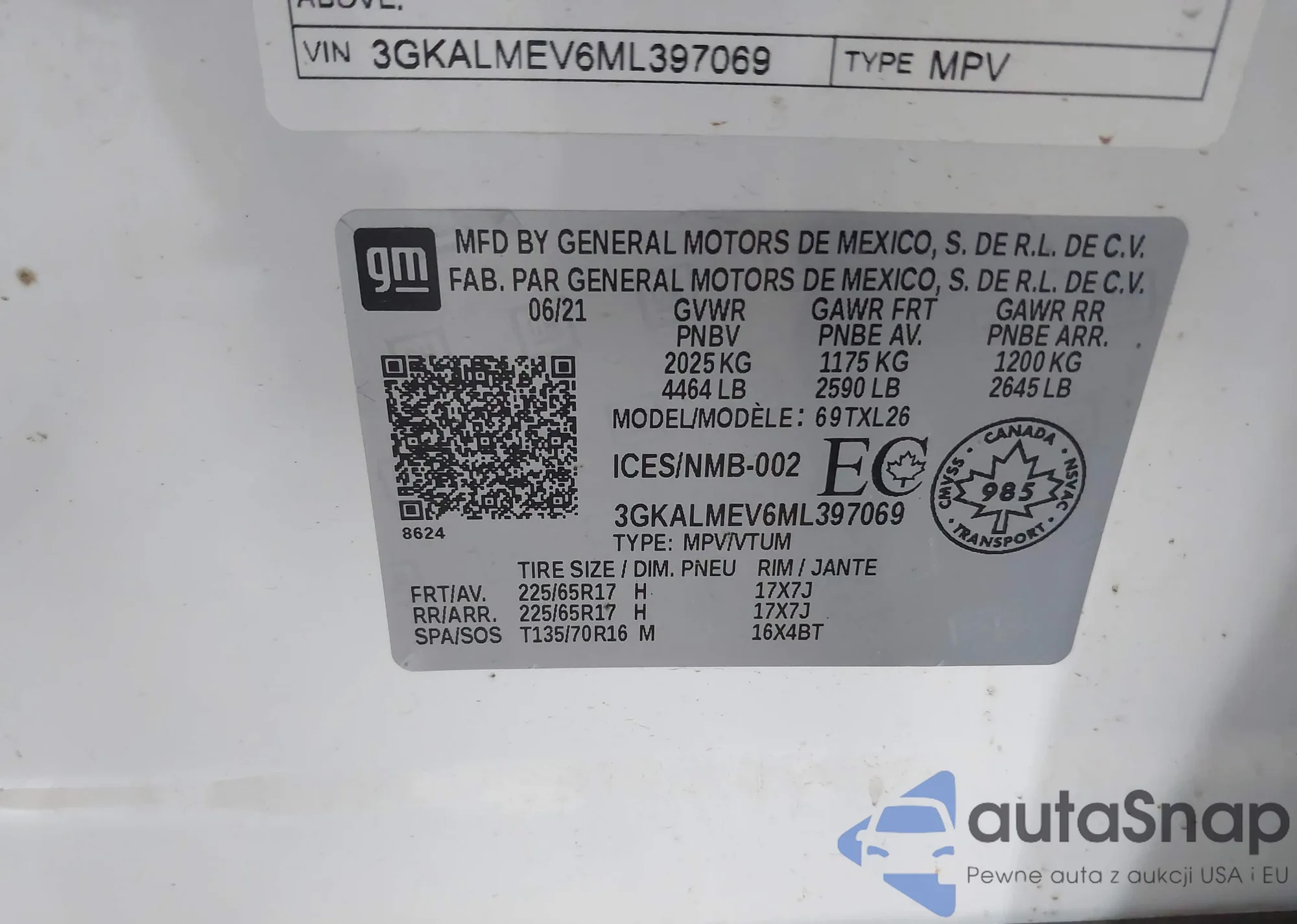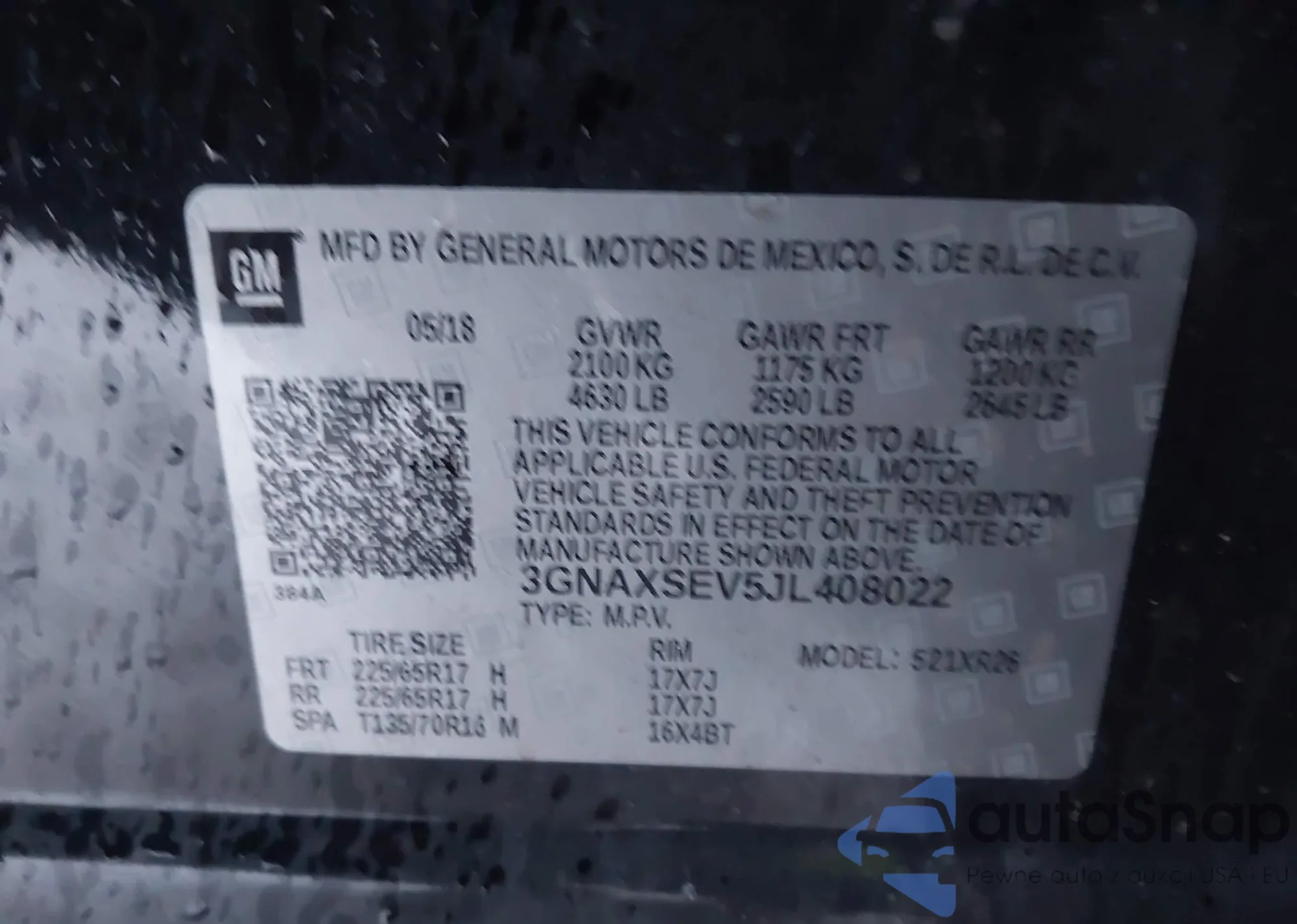 LOT: 43915003 VIN: 3GNAXSEV5JL408022