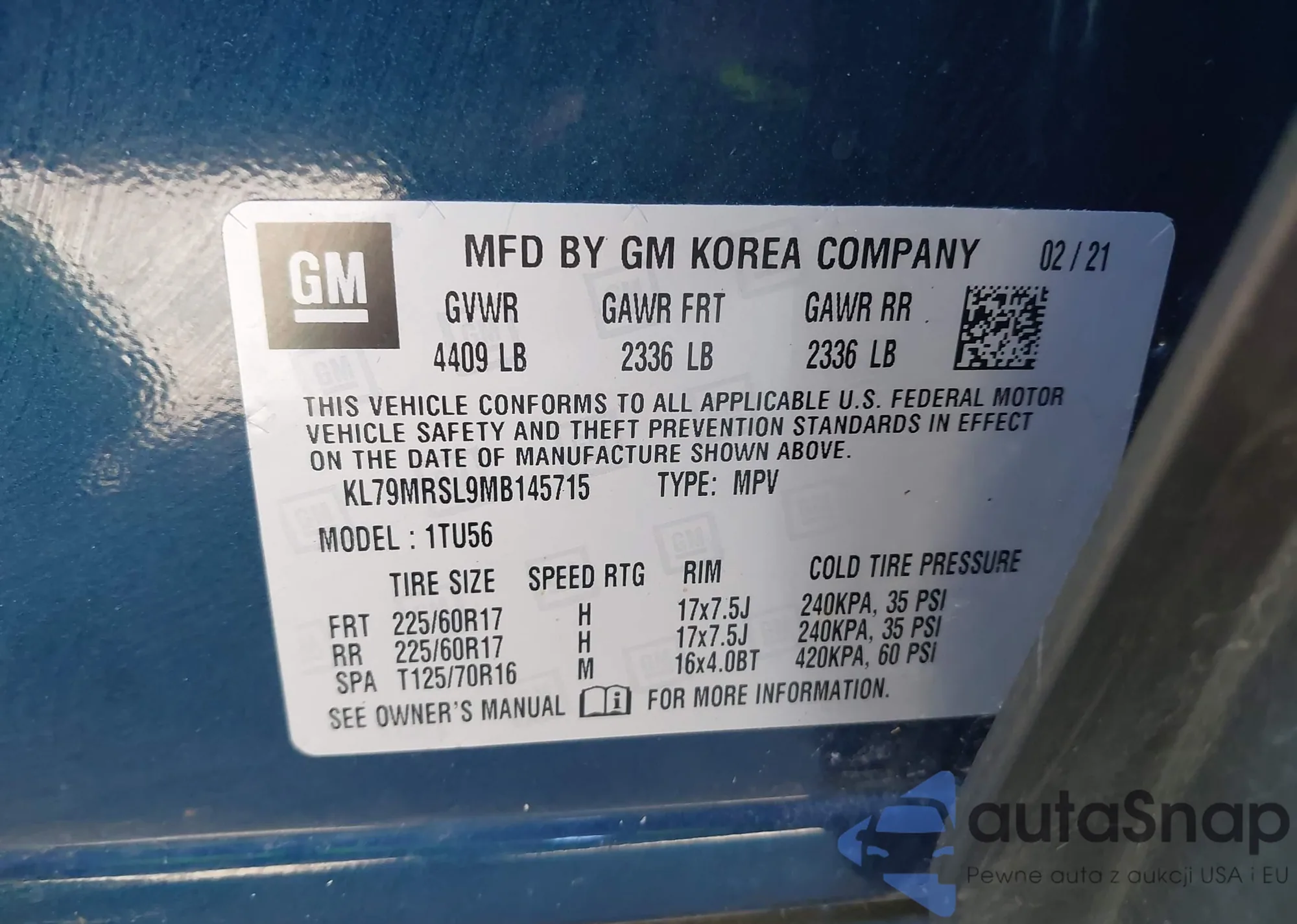 • VIN KL79MRSL9MB145715