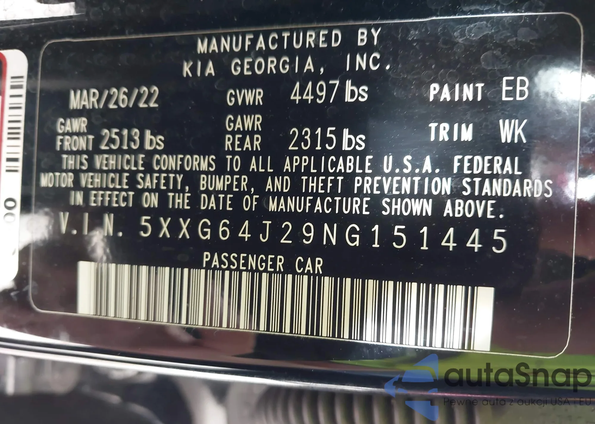 LOT: 43894127 VIN: 5XXG64J29NG151445