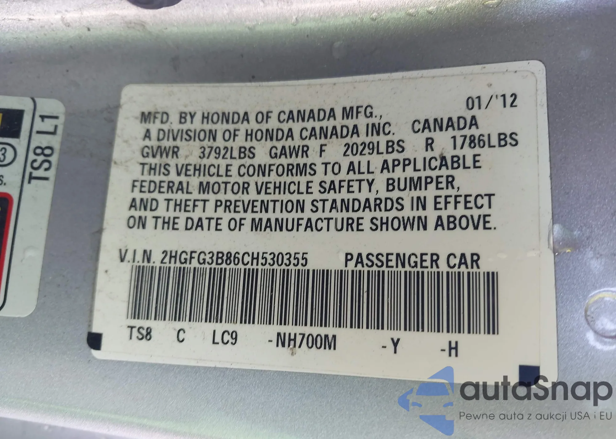 • VIN 2HGFG3B86CH530355