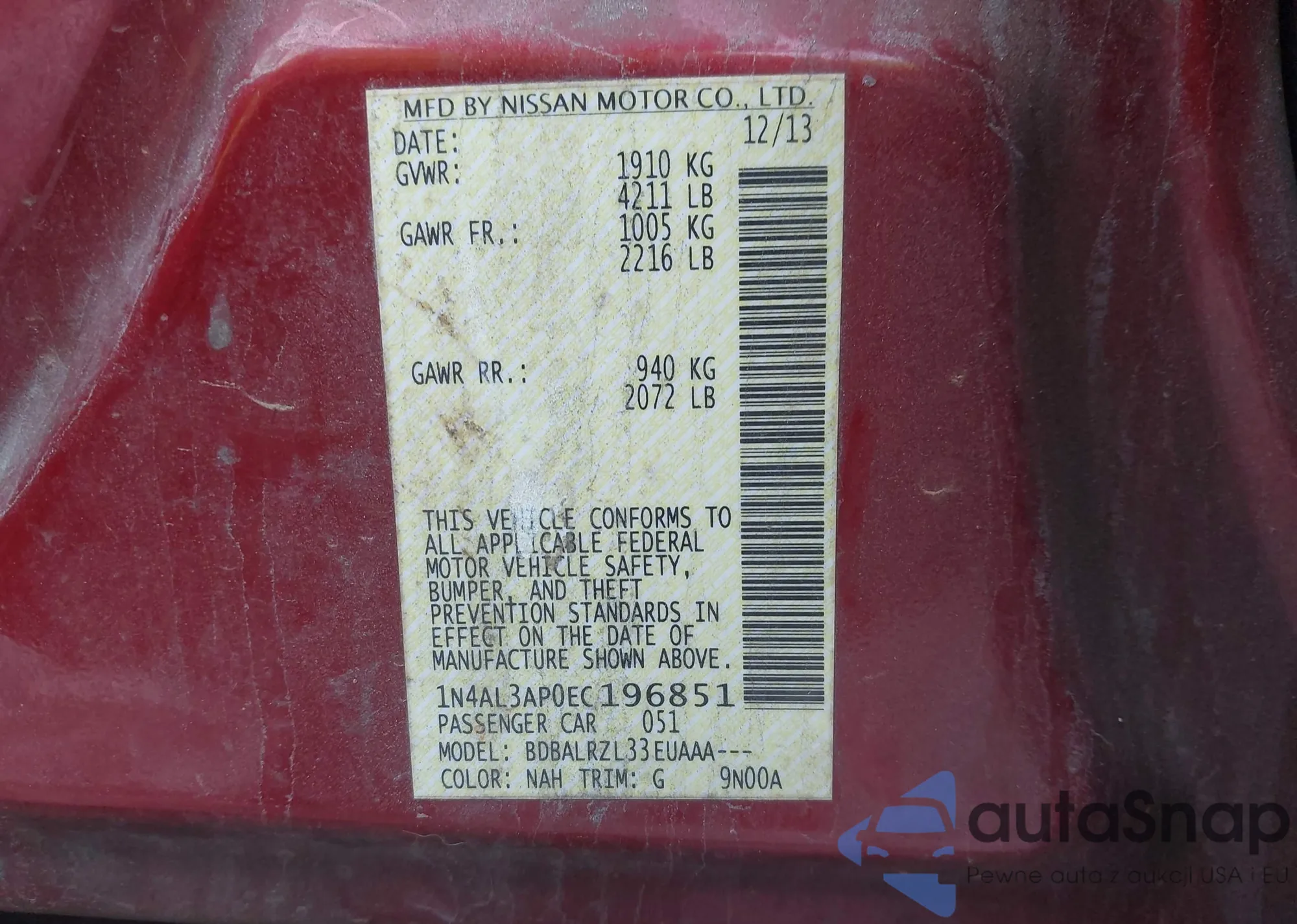 LOT: 43851081 VIN: 1N4AL3AP0EC196851