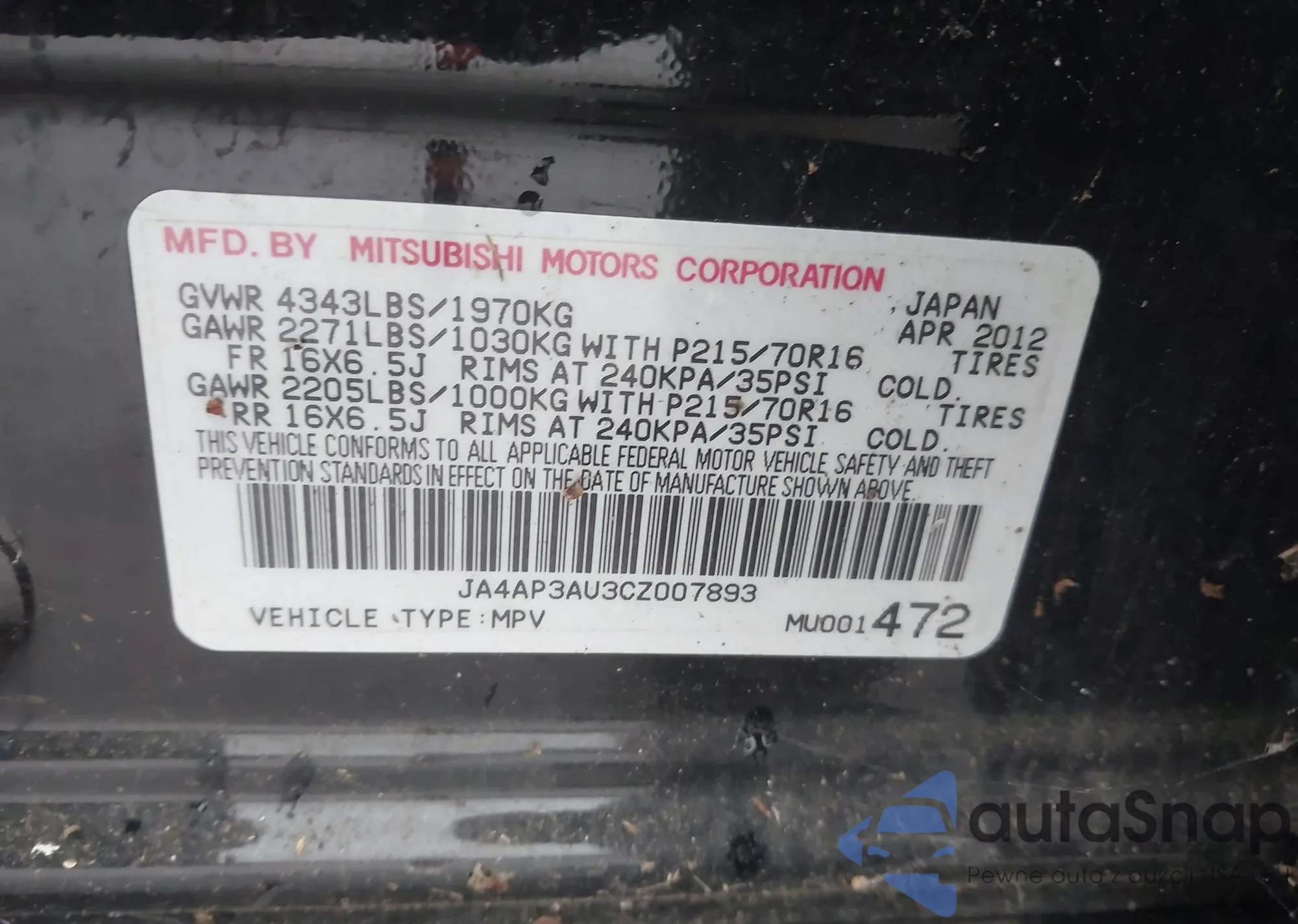 • VIN JA4AP3AU3CZ007893