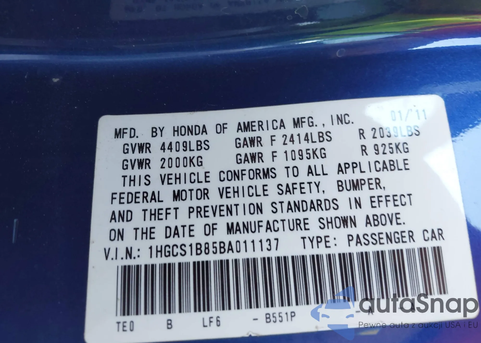 LOT: 43932235 VIN: 1HGFA16818L038701