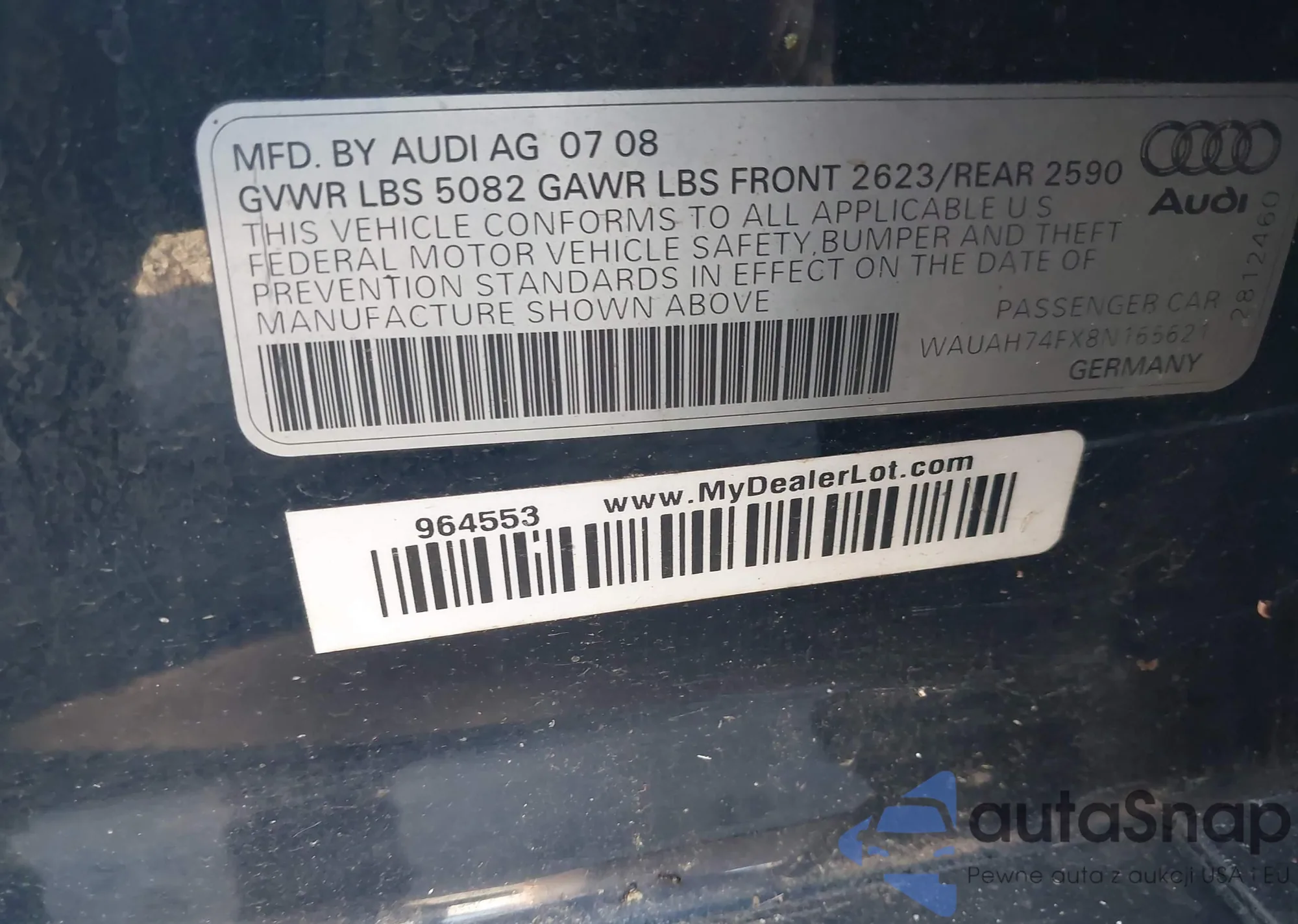 LOT: 44077455 VIN: WAUAH74FX8N165621