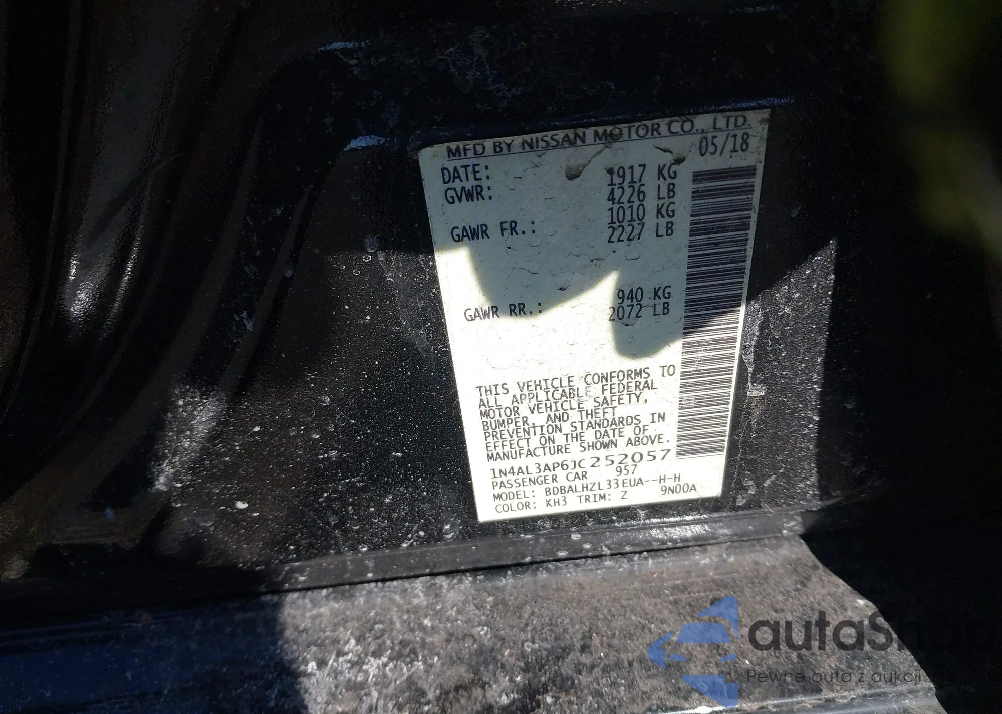 • VIN 1N4AL3AP6JC252057